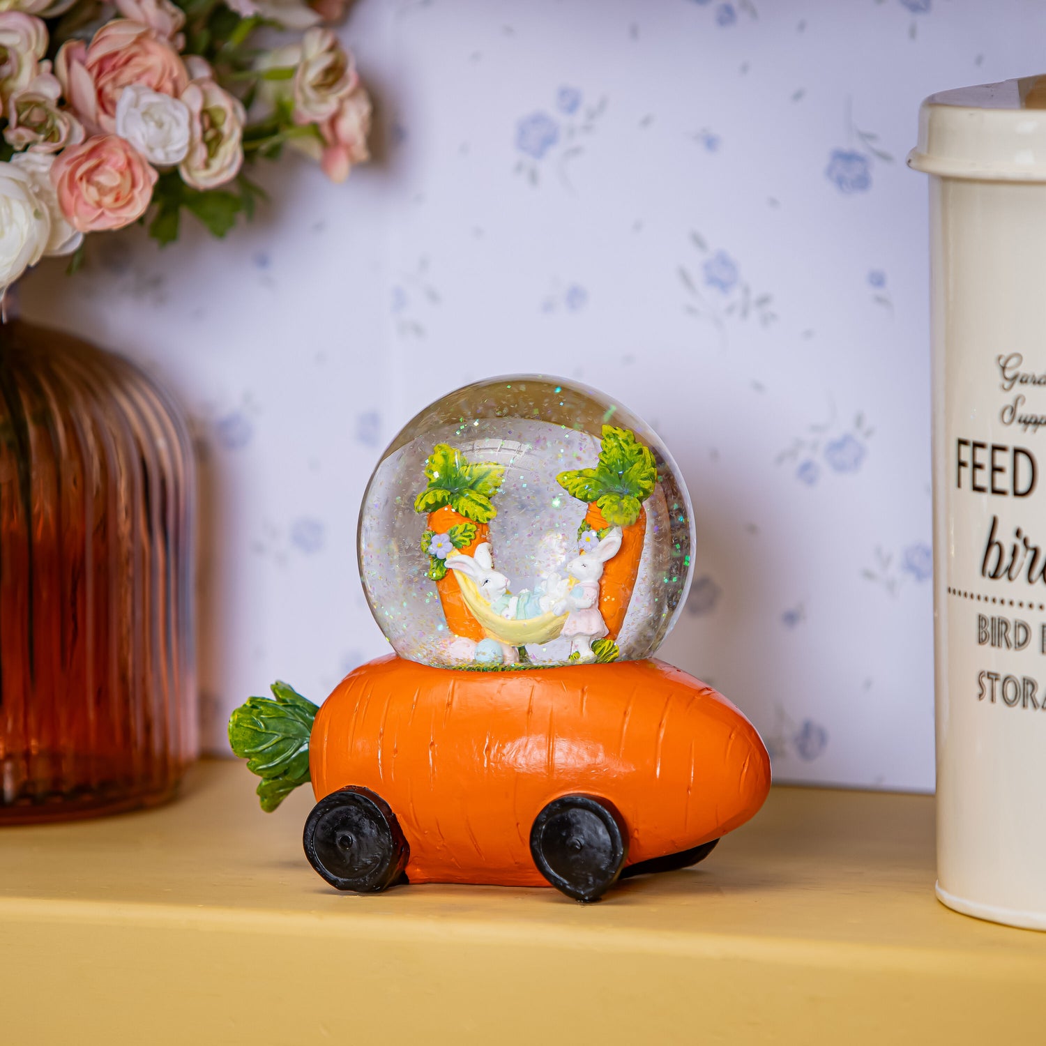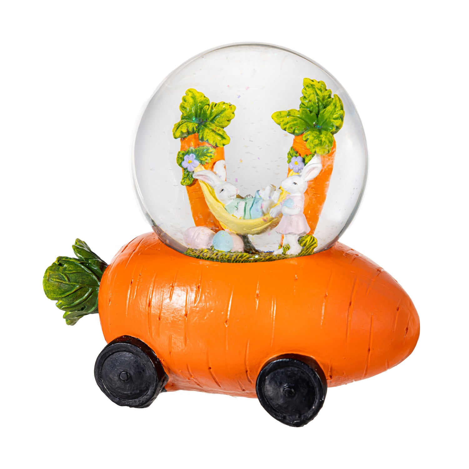 Bunny Blooms Water Globe Resin Carrot Car with Easter Bunny Scene, 6.5"L