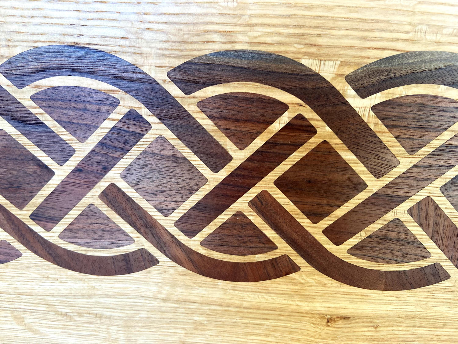 Experience the blend of tradition and craftsmanship with our White Oak charcuterie board featuring a complex Celtic knot inlay. Made from premium White Oak and adorned with a intricate design of Peruvian Walnut, this board is not just a serving platter, but a statement piece that adds a touch of elegance to any gathering. Perfect for serving a variety of dishes, from appetizers to main courses, this board is a must-have for any food enthusiast.