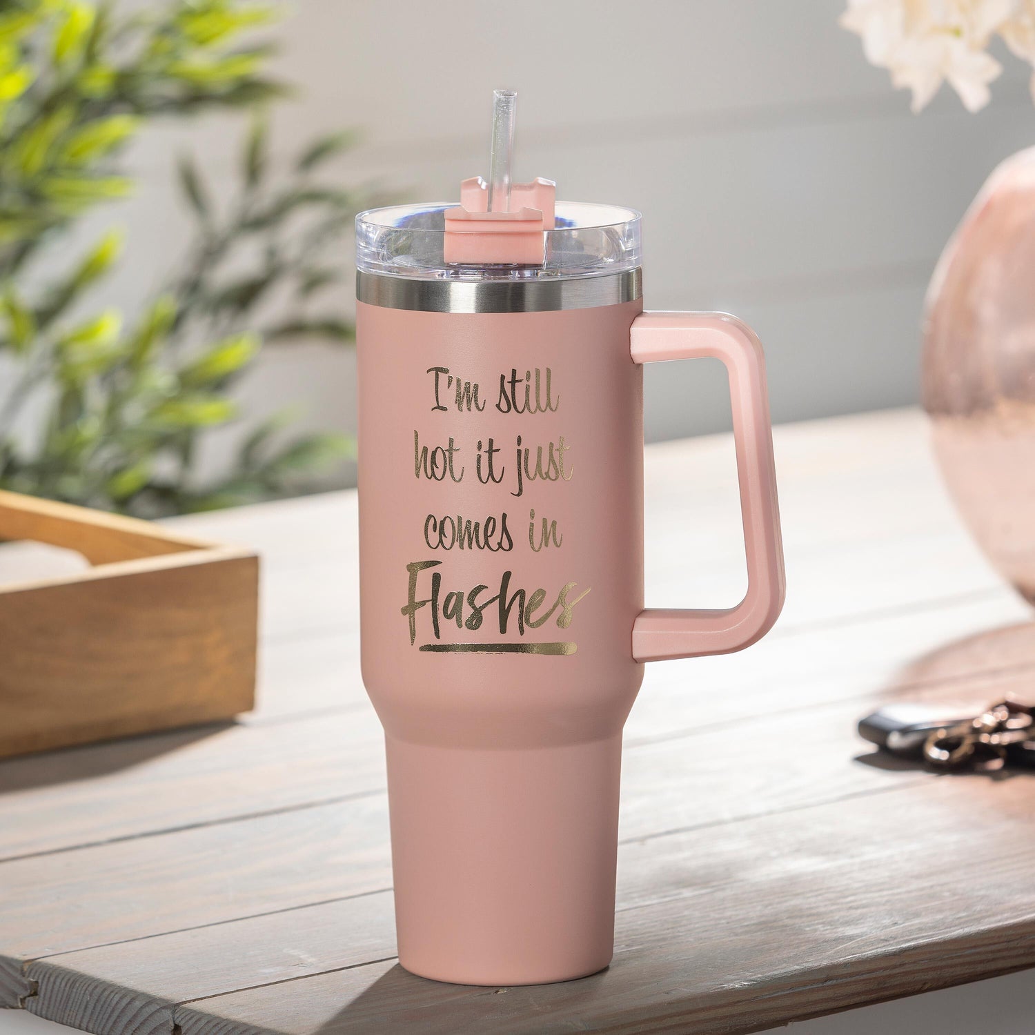 Never miss out on getting the needed water intake with this Canyon Cup. It’s not only functional but full of personality too. It features a light pink hue with a funny, metallic message that reads, “I'm Still Hot, it Just Comes in Flashes.” It holds up to 40 ounces of any beverage. Made from durable stainless steel, this cup will last year after year. It comes with a straw and the lid fits perfectly into the cups molded grooves for added security. It makes a great gift. This cup should be hand washed to ensure it lasts.
