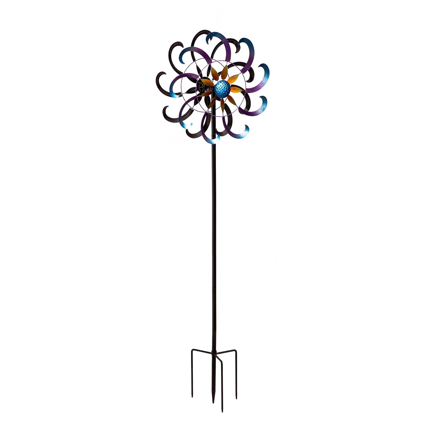 This Wind Spinner is perfect for adding color and whimsy to any outdoor space, garden, landscaping and more. The spinner is designed for movement when the wind blows; sit back and watch as the design comes to life in any gentle breeze. Its beautiful blue and purple flower design is an easy way to bring charm to any home. Made of durable, weather-resistant material, this outdoor accent is made to last year after year.