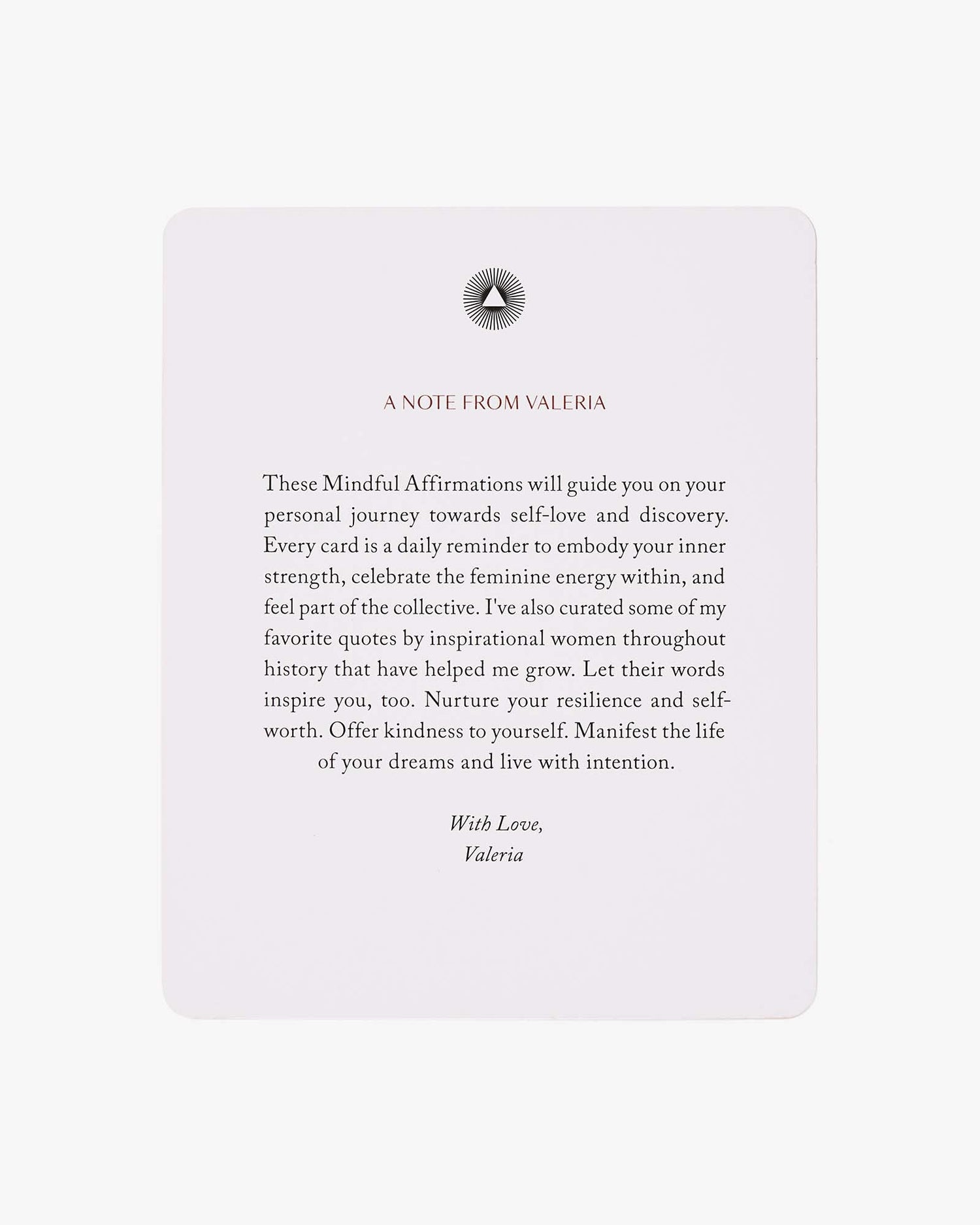 A special edition of Mindful Affirmations by Valeria Lipovetsky. Each double-sided card offers an affirmation on one side and a quote from an inspirational woman on the other, bringing together wisdom and encouragement for your daily life. Whether you use them for a quick boost in the morning or to unwind at night, these cards are a simple yet powerful tool for staying connected to your inner strength. Makes a perfect gift.