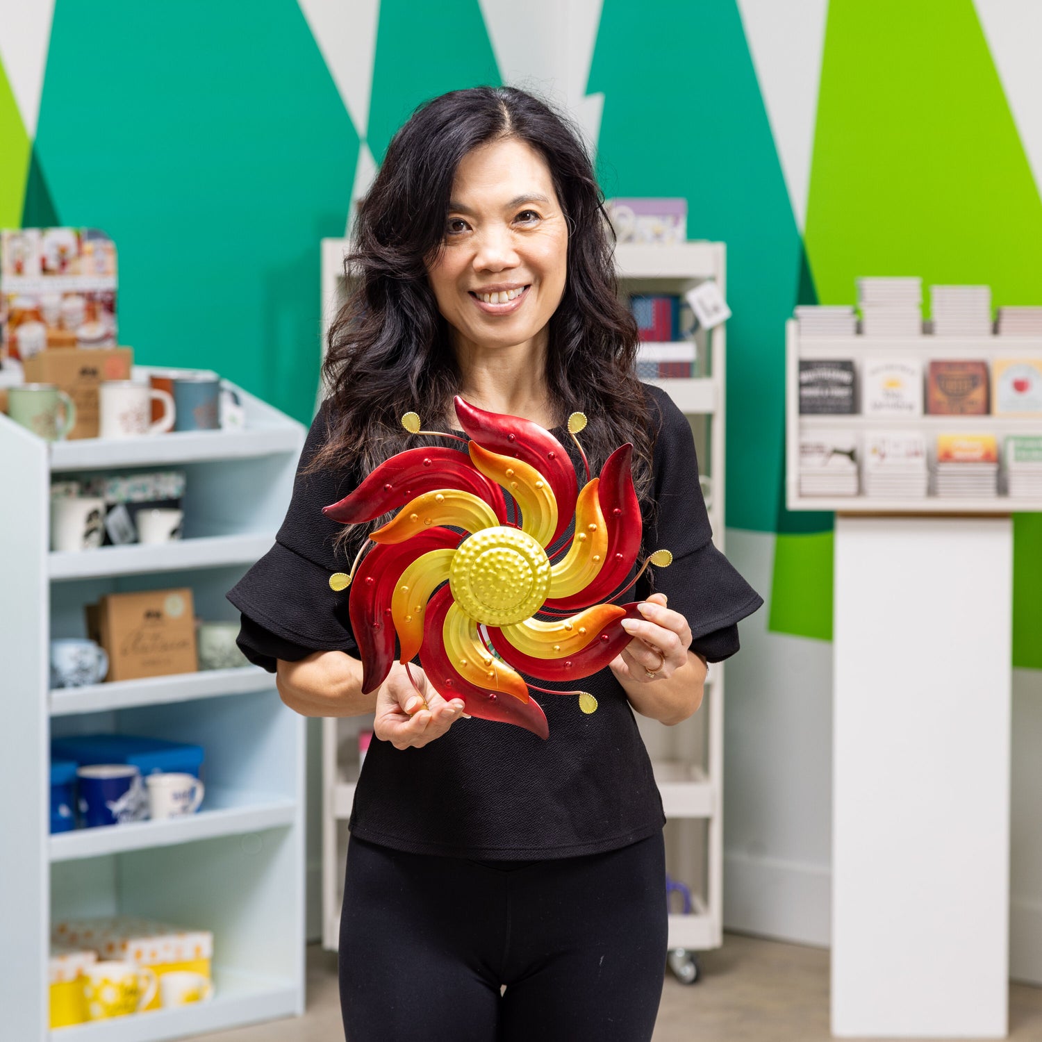 Create a mesmerizing display in any outdoor space, garden, or landscaping with this statement wind spinner. This spinner is designed to move when the wind blows; beautifully spinning in a way that will capture everyone's attention. Sit back after a long day and relax on the front porch while watching it come to life in the gentle breeze. Crafted from outdoor safe and weather-resistant materials, it's designed to endure the elements and last season after season.