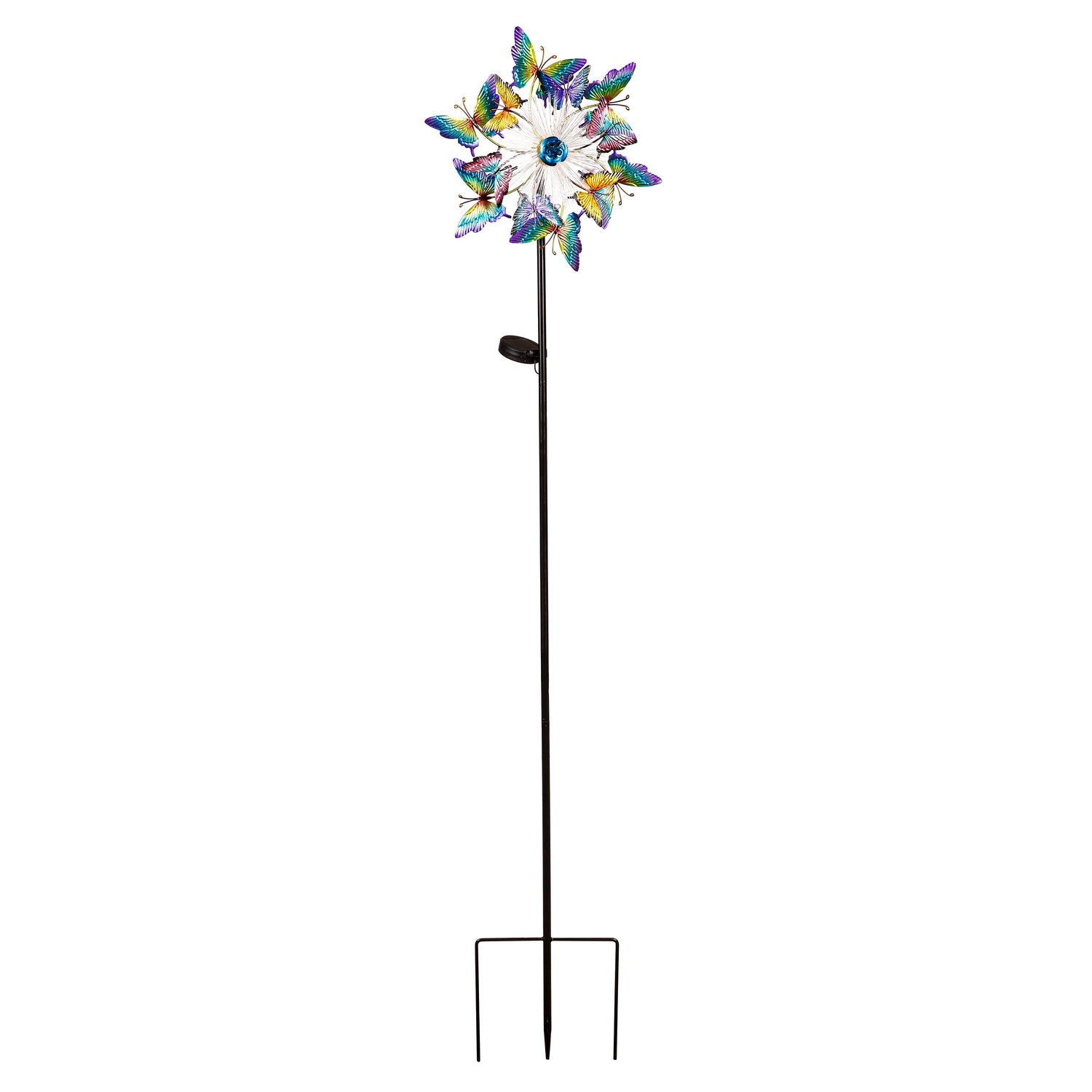 This vibrant kinetic spinner features a stunning array of multicolored butterflies arranged in a circular bloom pattern. As the wind catches the petals, they spin gracefully to create a mesmerizing show. At dusk, the built-in solar light illuminates the center, casting a warm, enchanting glow over your landscape.