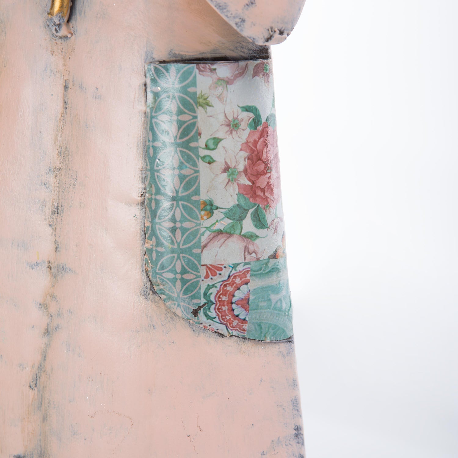 • Statue looks like a children's book illustration in muted colors and decoupage detailing