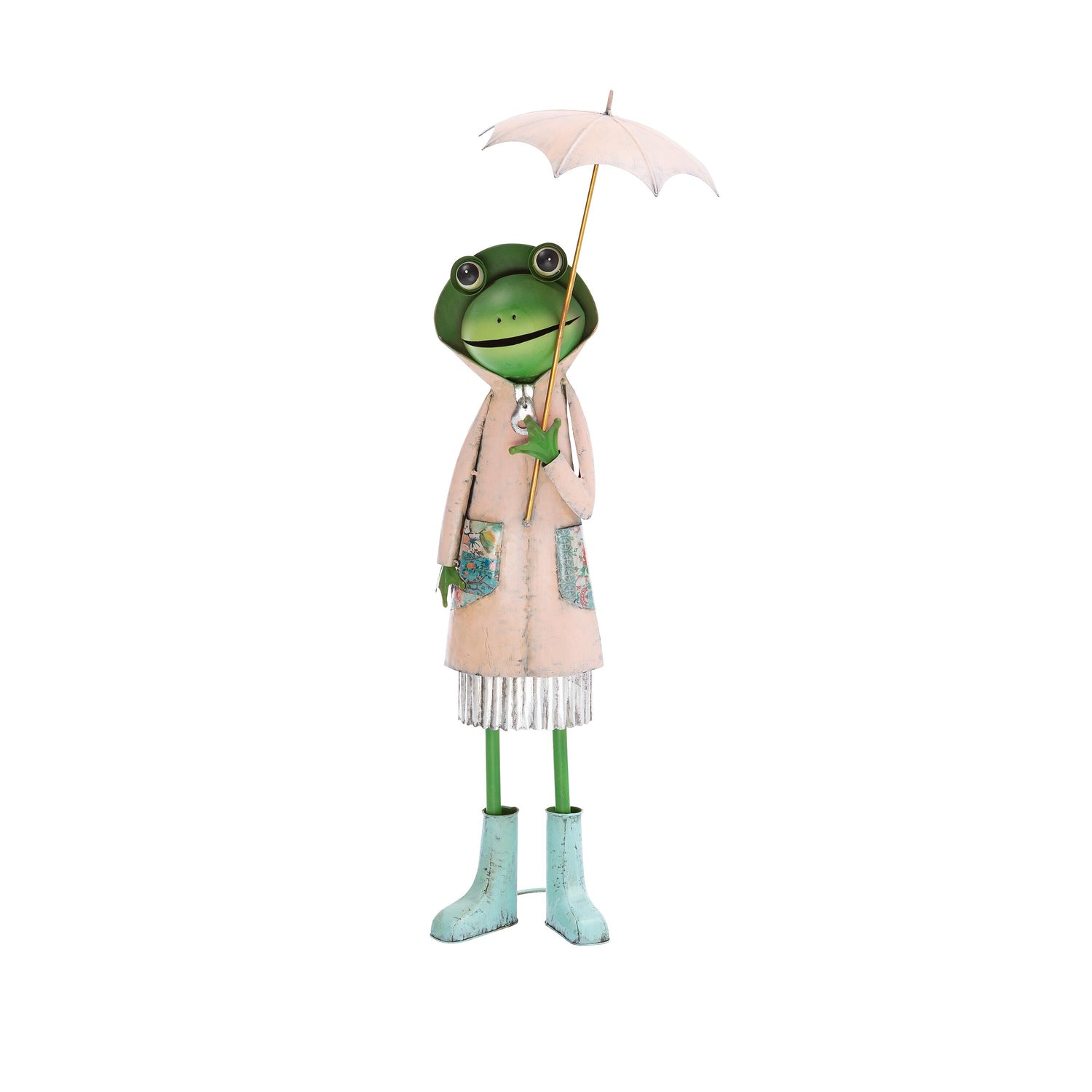 Add our Metal Frog Garden Statue to your yard or garden to give it a whimsical storybook look. These fanciful frogs stand more than two feet high, and are sure to catch visitors' attention. The frogs have a stylized appearance with amazing detail, including hammering and slightly distressed paint. They have floral decoupage-style detailing on their pockets, adding to the living illustration effect. This frog statue will look right at home in a flower bed, on the porch or near a water feature, but they're wonderful indoors too. The choice of pink or blue colors also make them ideal for a child's room or nursery. A wonderful gift!