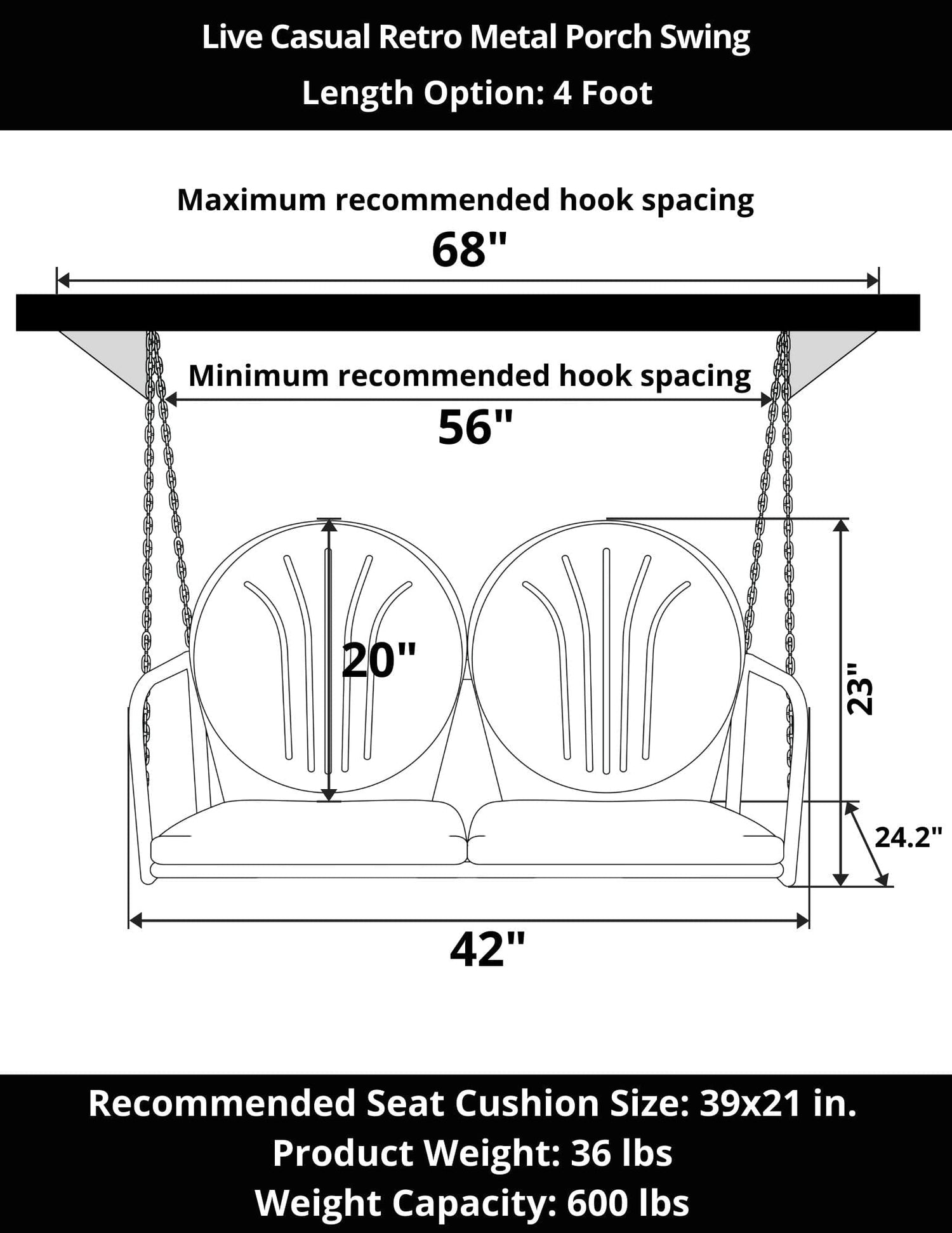 Step back in time with this vintage-styled porch swing, featuring an authentic design boasting intricate details in both pattern and construction. Crafted from robust steel, powder-coated for enhanced durability, and available in vibrant teal, yellow, or red options, this swing is not only a nostalgic centerpiece but also resilient against rust, air pollution, salt, chlorine, UV fading, and rain exposure. Complete with rust-resistant hardware, zinc-plated chains for an 8-foot ceiling height, and bolt covers for a polished finish, it's the perfect blend of style and substance for your outdoor space.