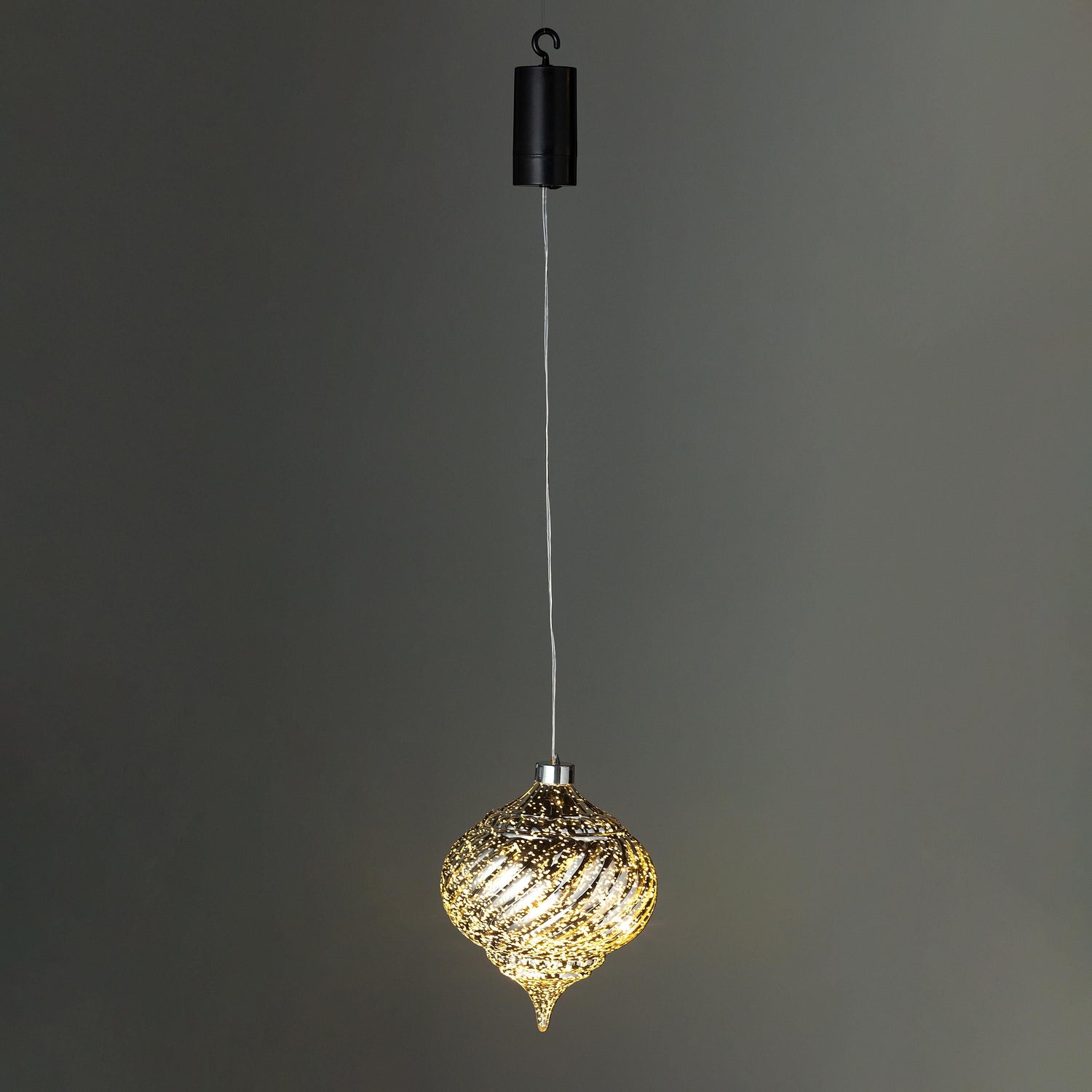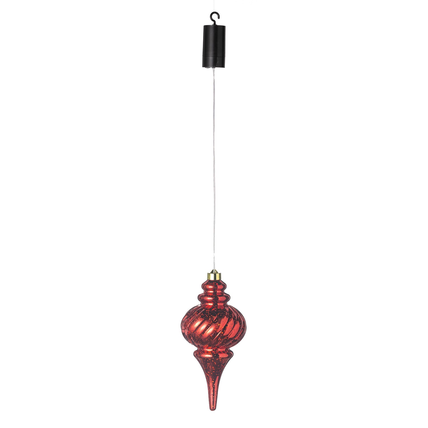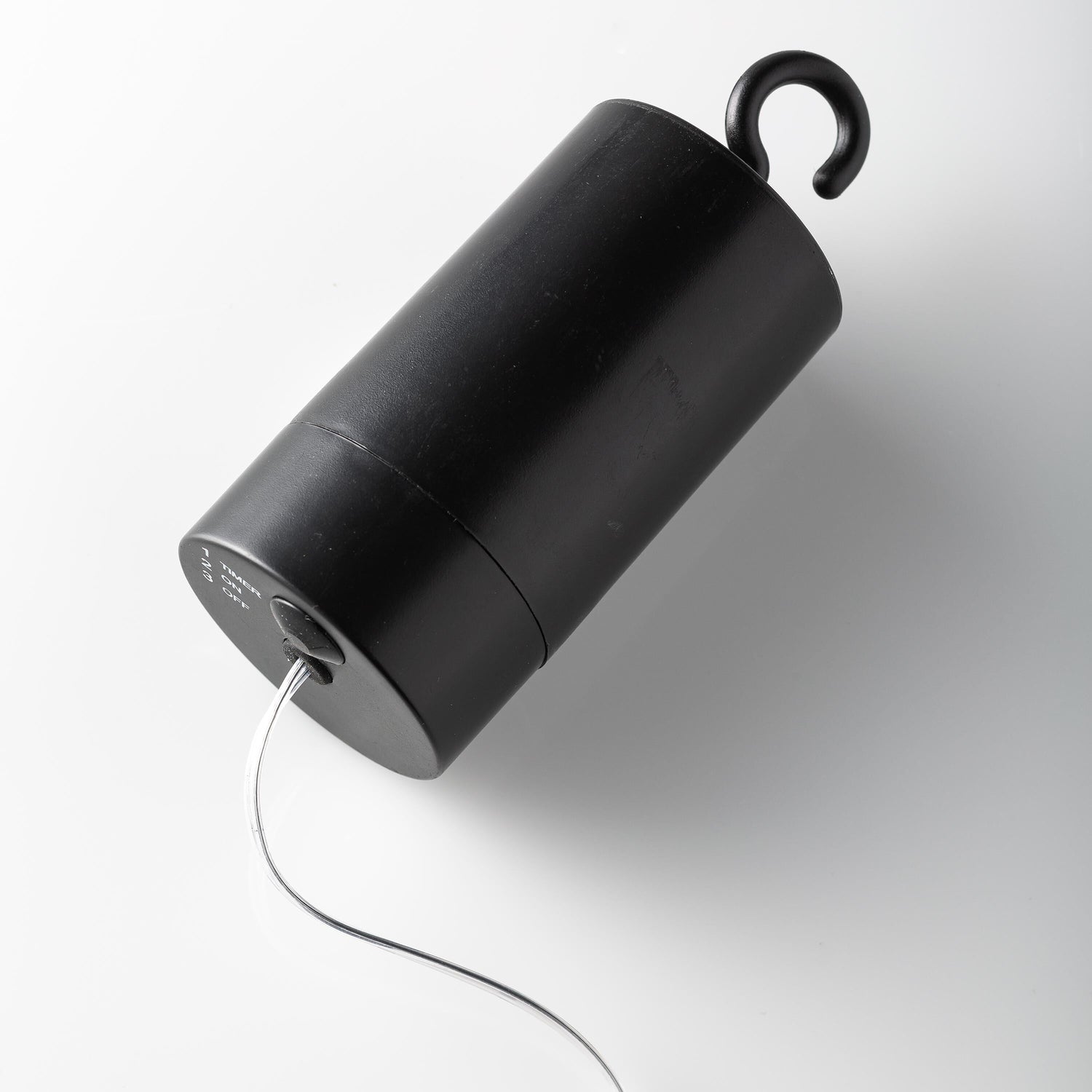 - Hanging cord with hook has a built-in battery pack that operates on a timer