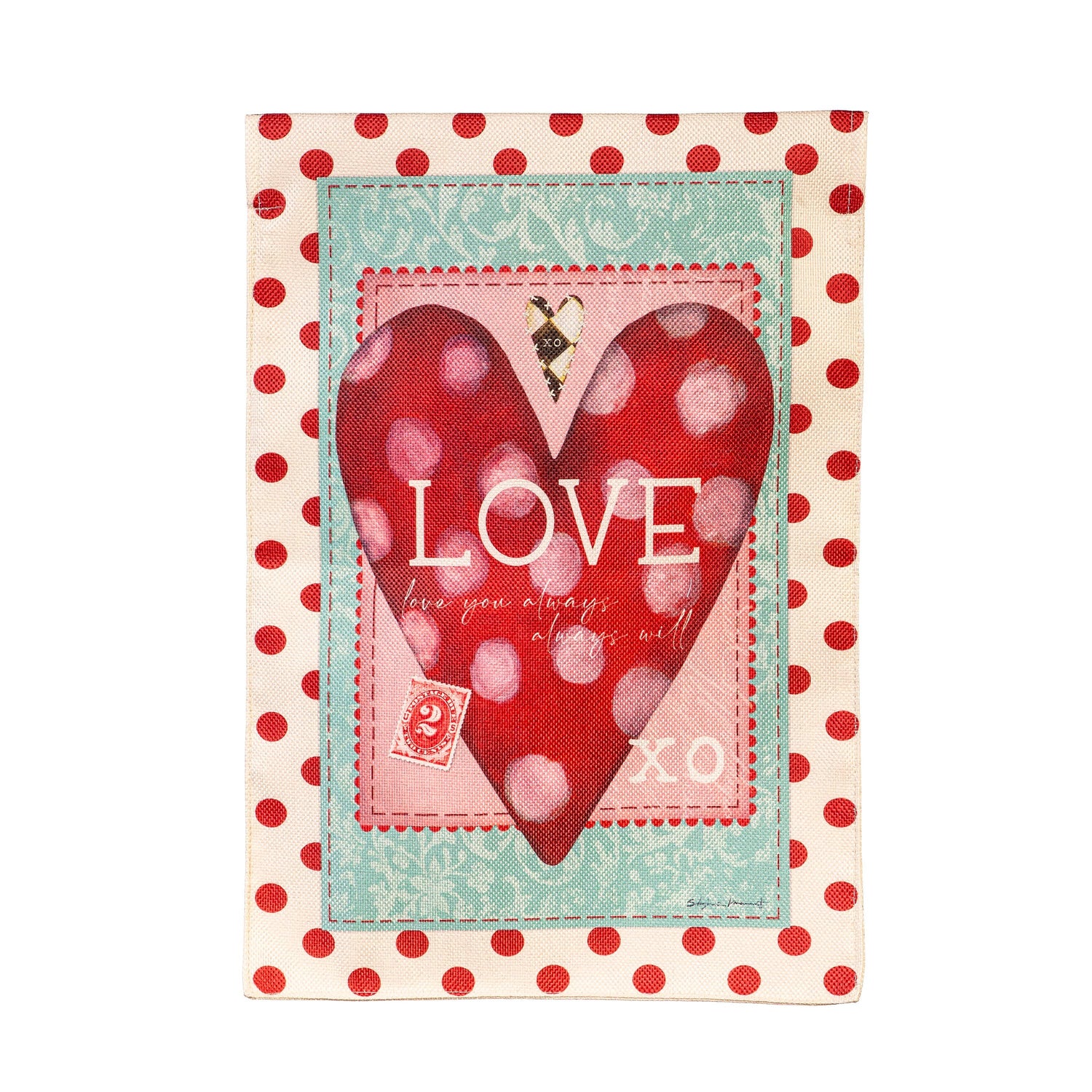 This eye-catching flag adds an extra special touch to any garden or outdoor space. With its vibrant, cheerful looks and Vintage Valentine design, this flag welcomes friends and family in beautiful style. This flag is made of medium-weight, soft burlap fabric that's made from recyled plastic that has the look and feel of real burlap. Artwork is heat transferred onto both sides of the textured fabric to create a natural, crafted look. The flag is durable and weatherproof and will not fade or fray after continued display. This flag features a sleeve for use with any standard flagpole or stand, sold separately.
