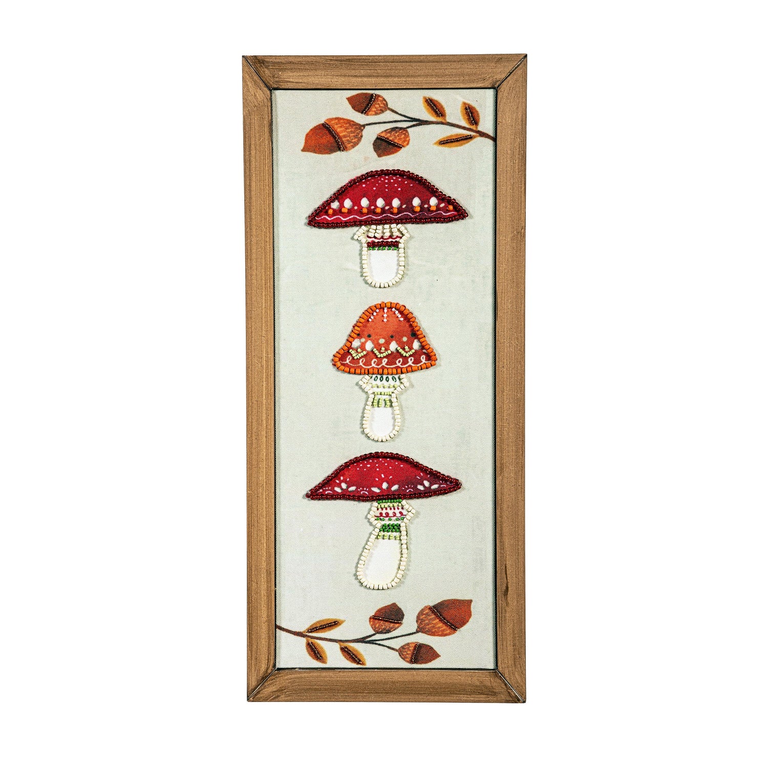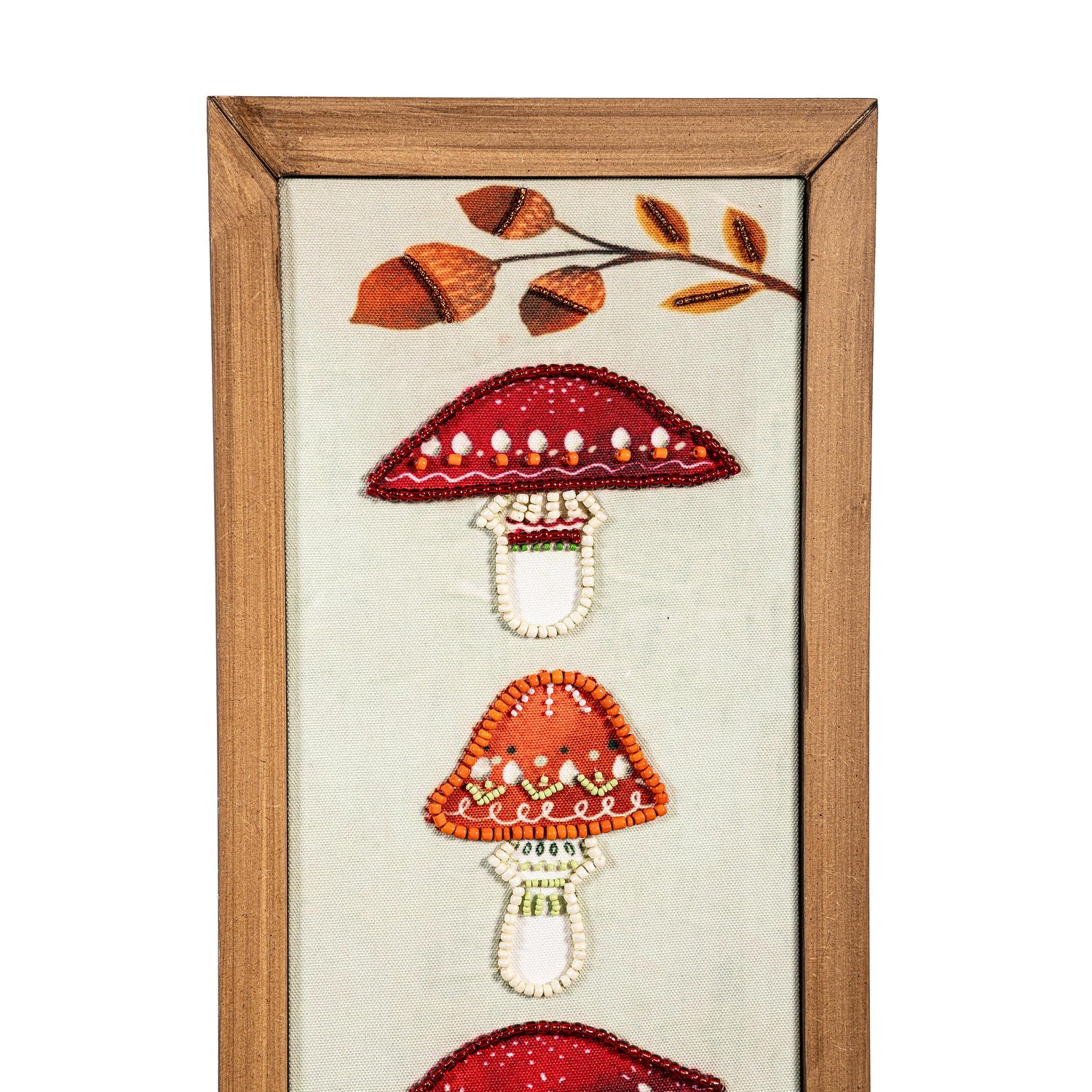 Woodland Storybook Indoor Wall Decor, Textile Beaded Mushroom with Wooden Frame, 8" L x 18" H