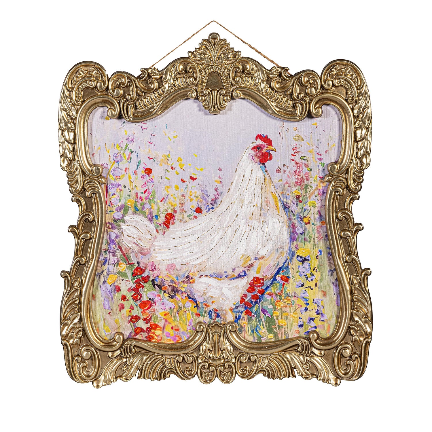 Petal & Plow Indoor Wall Decor, Wood, Chicken in Gold Decorative Frame, 20" L x 23" H