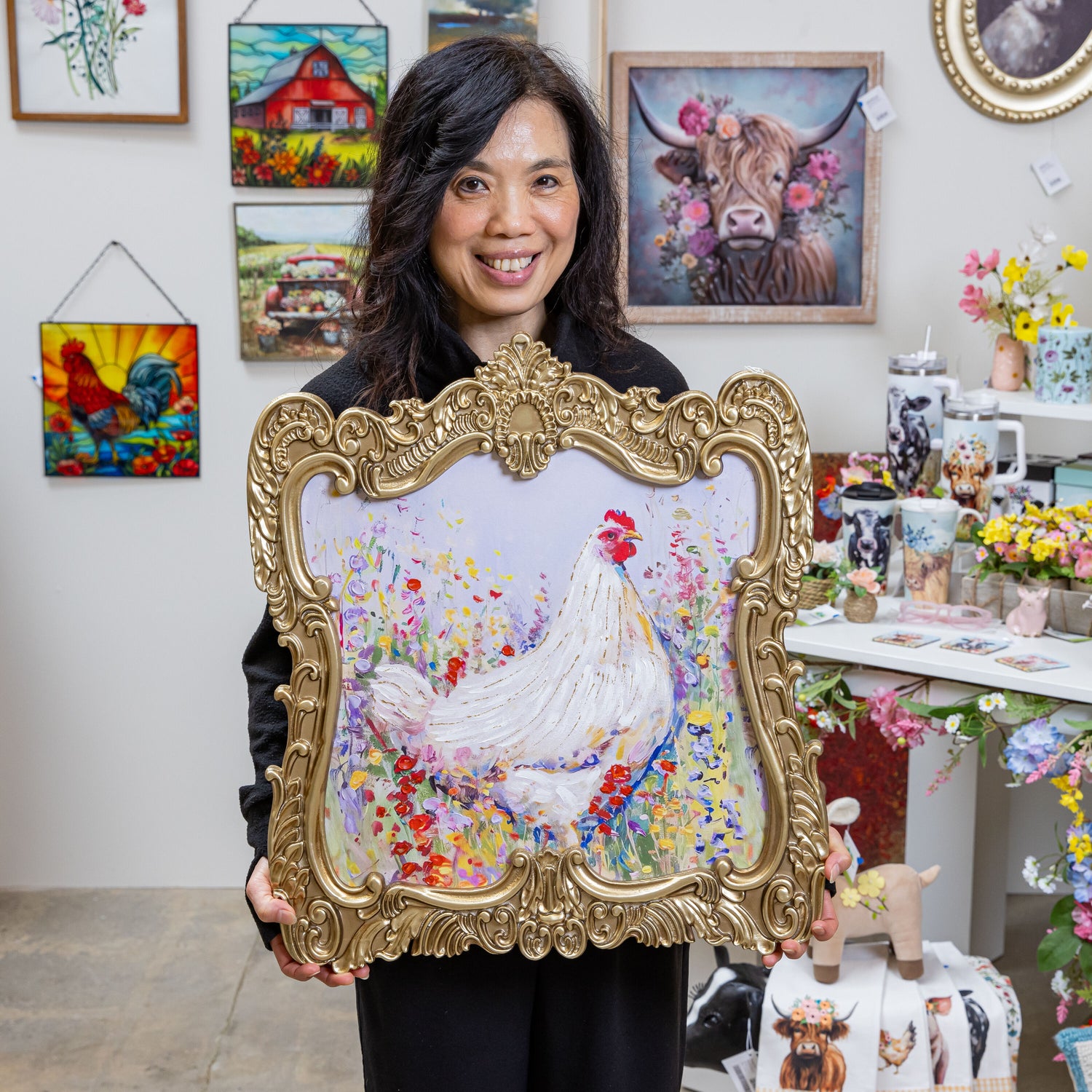 - Bring a touch of whimsy and charm to any space with this delightful chicken portrait,
