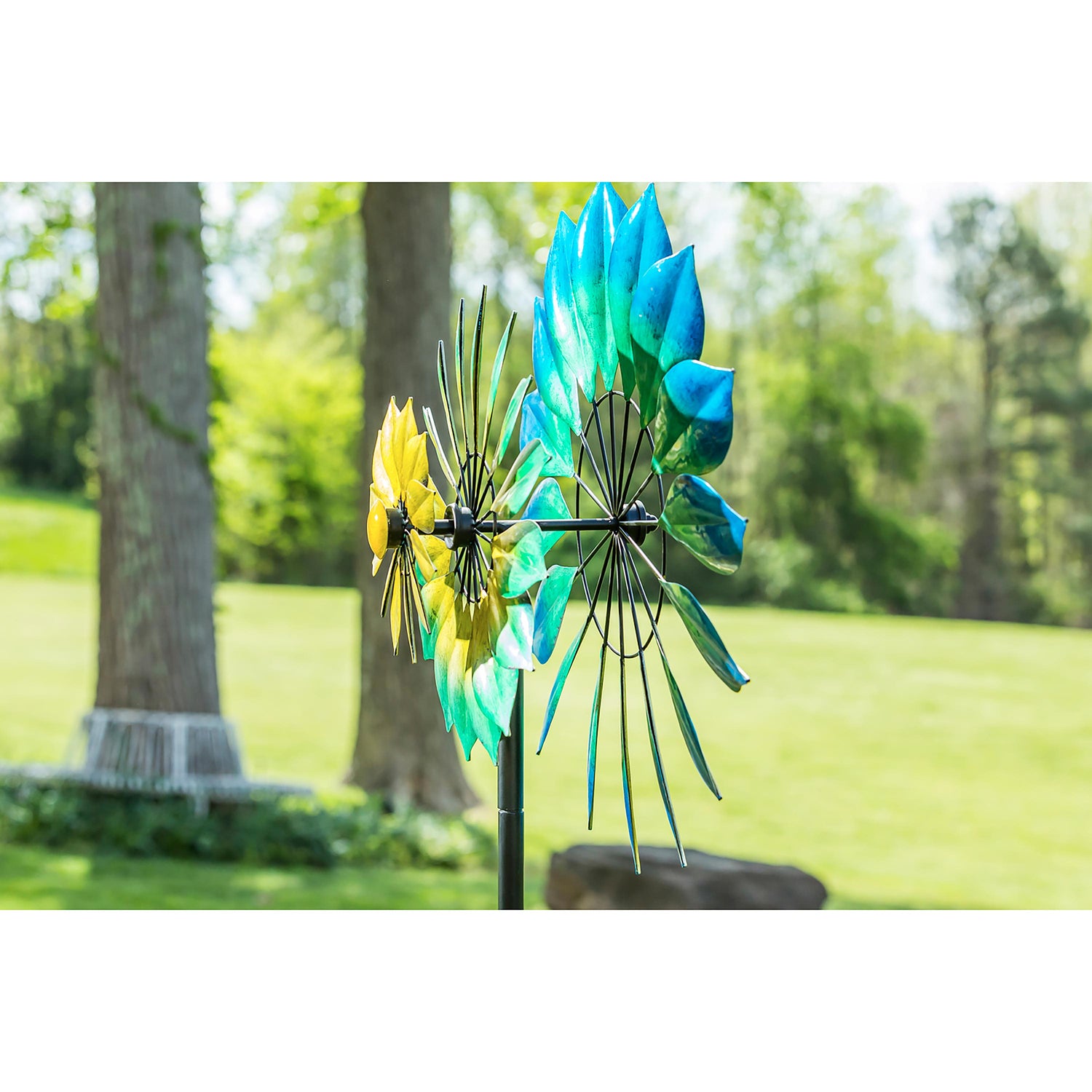 Your yard will be transformed into a stage that displays the mesmerizing movements of this Oceanic Dimensions Wind Spinner. It's impossible not to delight in its vibrant splendor. The eye-catching design is brought into motion whenever the wind blows. With its yellow and teal panels, this striking kinetic is made of powder-coated metal with a weather- and rust-resistant finish to prevent fading. Once the stake is put together, installing your kinetic is easiest in moist soil or grass. Push the bottom prongs into the soil until they are completely covered. No tools are necessary. Wind direction varies on high and low pressure, so there is no optimal direction to place the kinetic.
