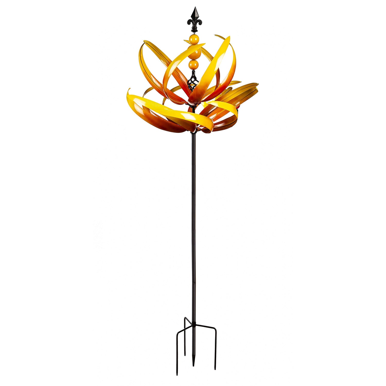 Transform any garden into a stage that displays the mesmerizing movements of this Yellow Lotus Wind Spinner. With ornate panels with an ombre finish, this design comes to life with every passing breeze. The striking kinetic is made of powder-coated metal with a weather- and rust-resistant finish to prevent fading. Once the stake is put together, installing the kinetic is easiest in moist soil or grass. Push the bottom prongs into the soil until they are completely covered - no tools are necessary.
