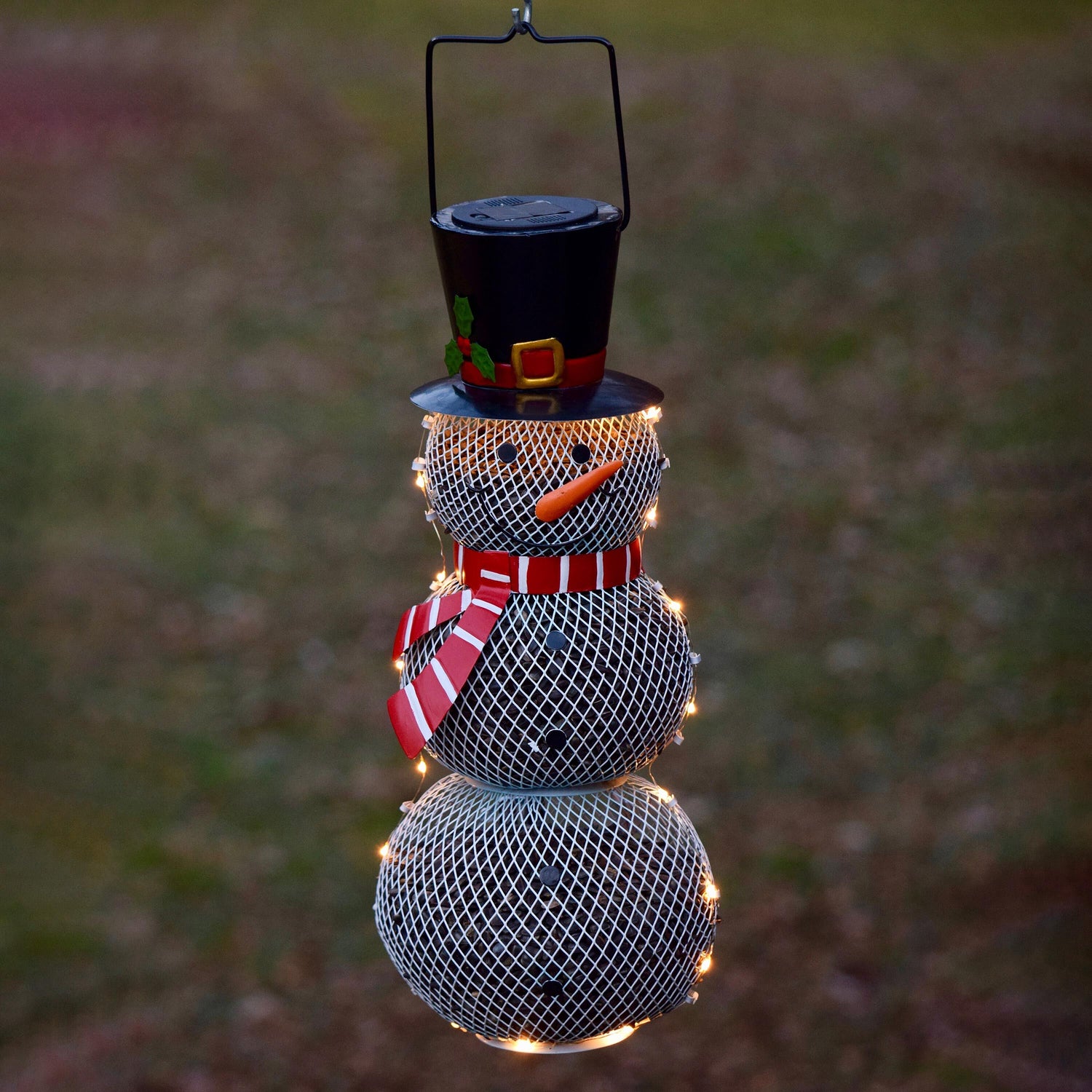 Add a lighthearted holiday accent to your yard while feeding your favorite birds. Our Solar Snowman Metal Mesh Bird Feeder has a solar panel in his hat that powers a set of string lights after dusk.