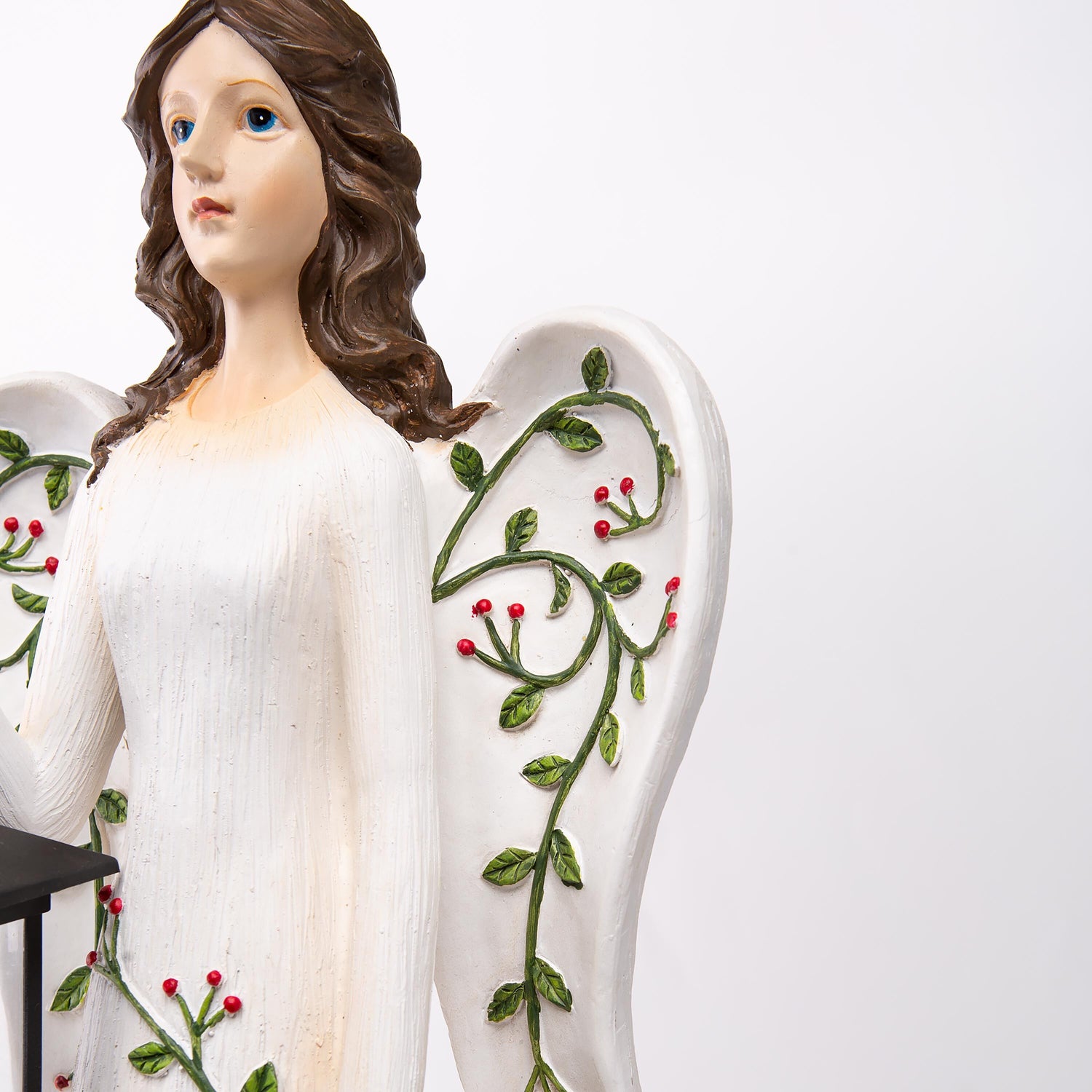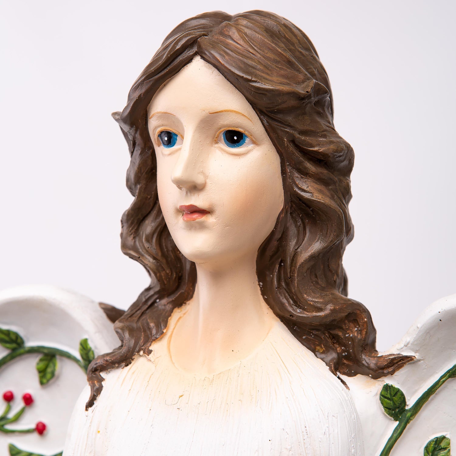 She gazes skyward toward the heavens and has a Cardinal perched on her hand. Her wings and gown are covered in intricate vines, accented with red berries and poinsettia.