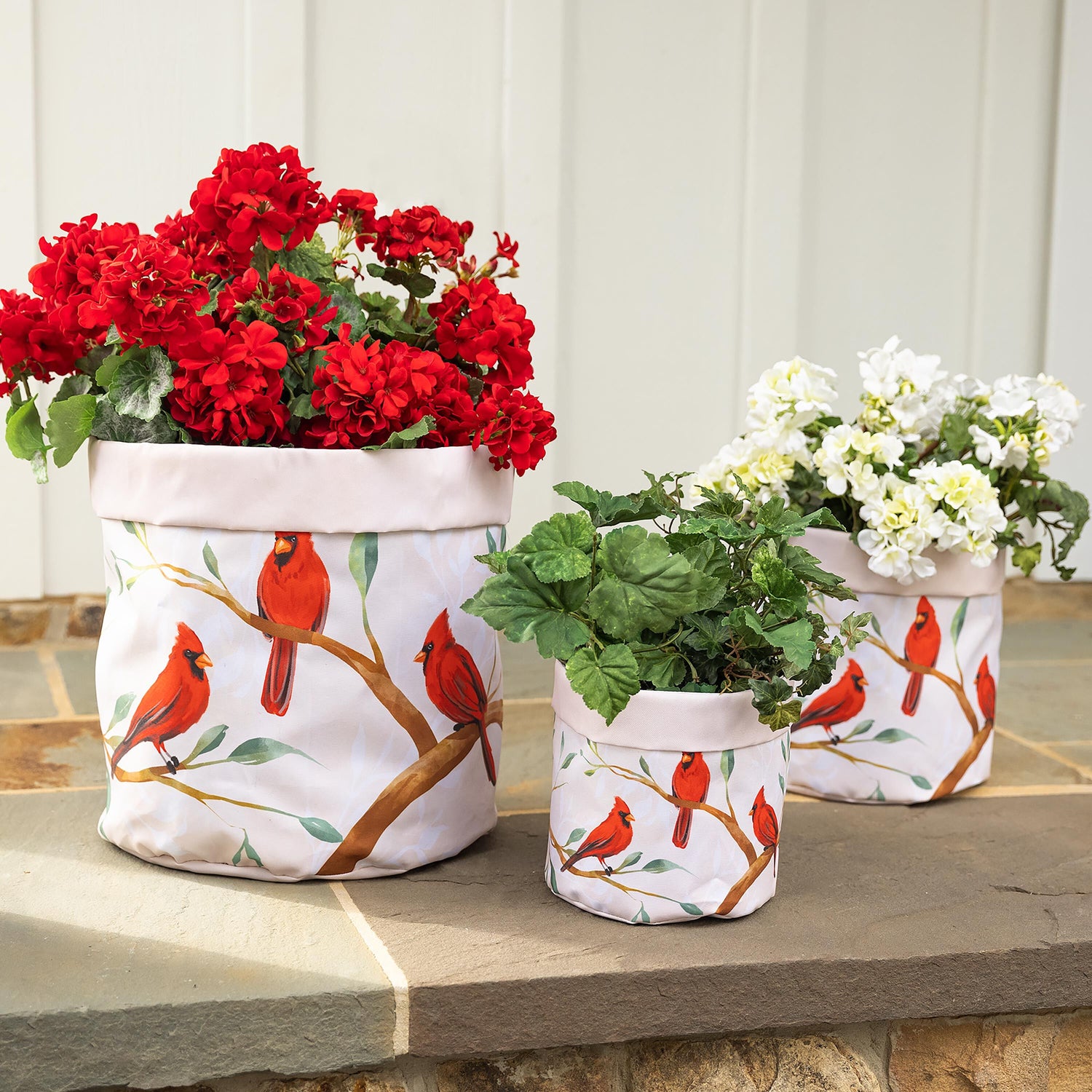 Our versatile set of three canvas planters, featuring charming bird designs, can be used in so many ways! Each set includes a small, medium and large container designed for planting flowers, herbs or veggies.