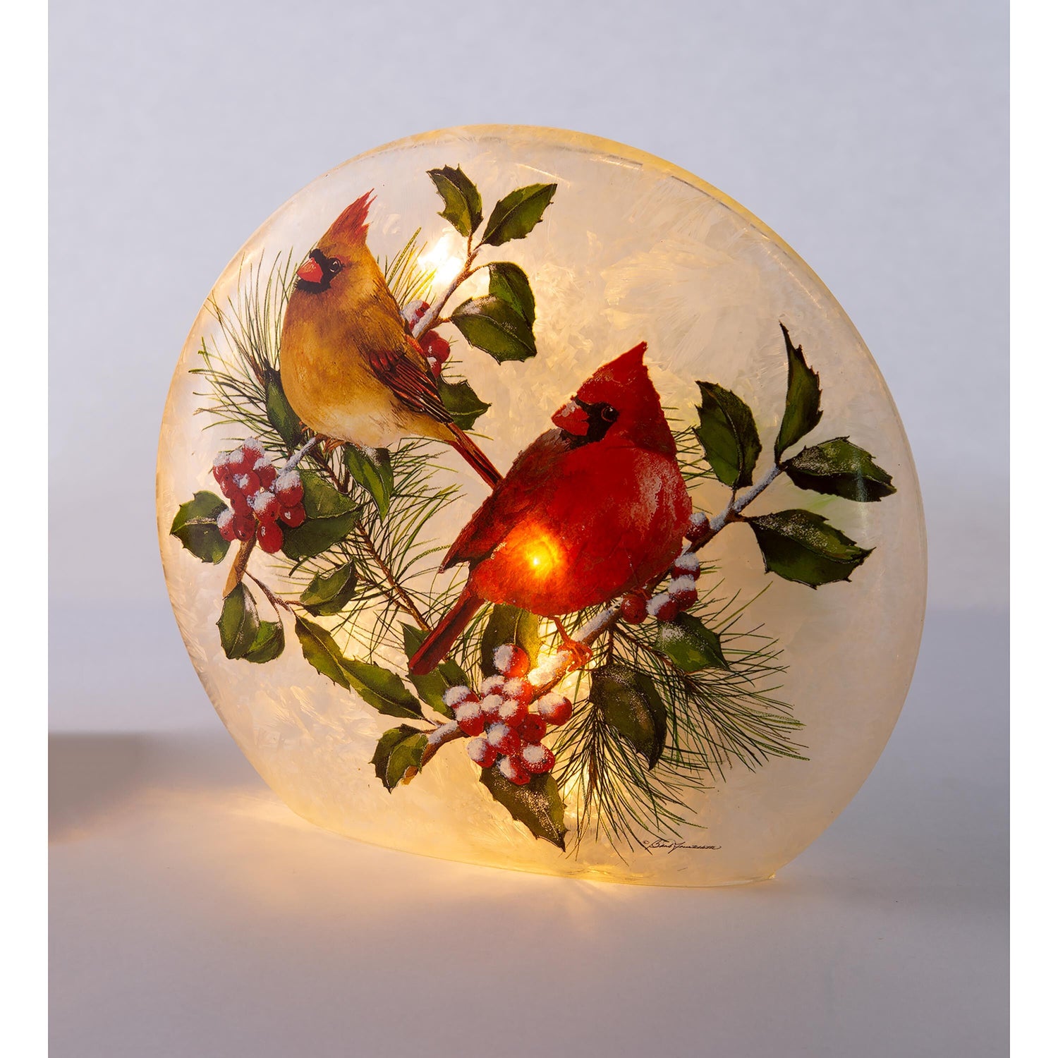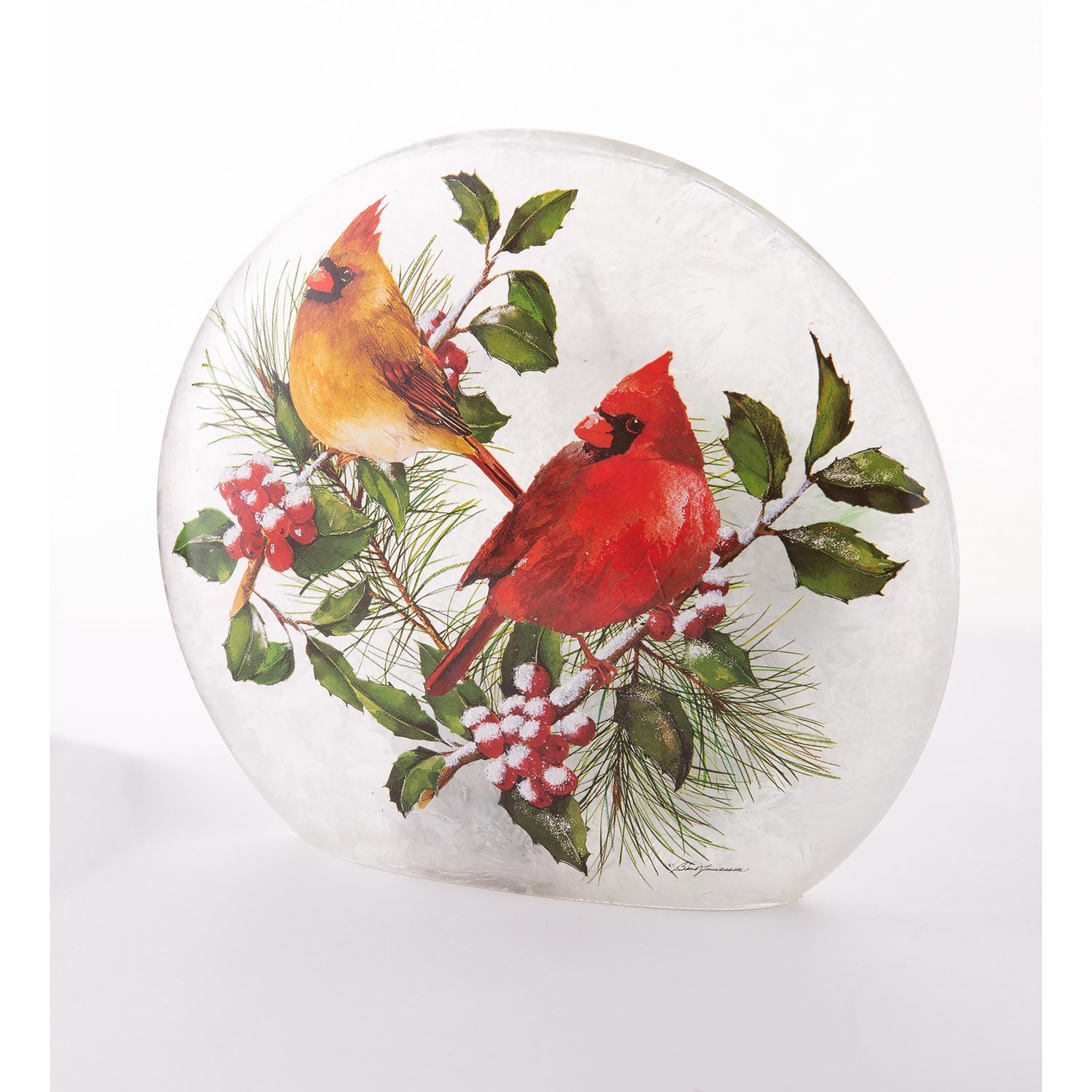 Add instant ambiance to any room with our lovely and colorful Winter Cardinals Frosted Glass Accent Light.