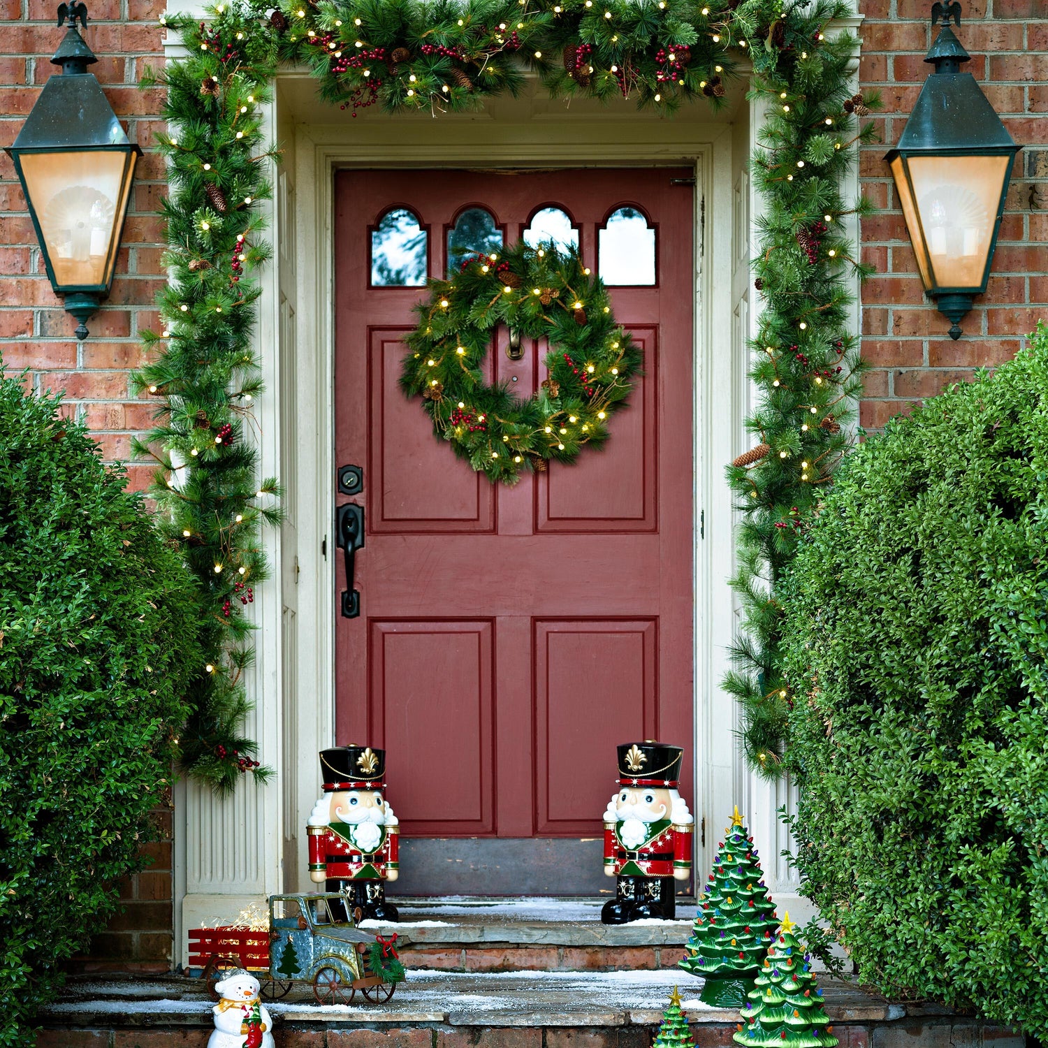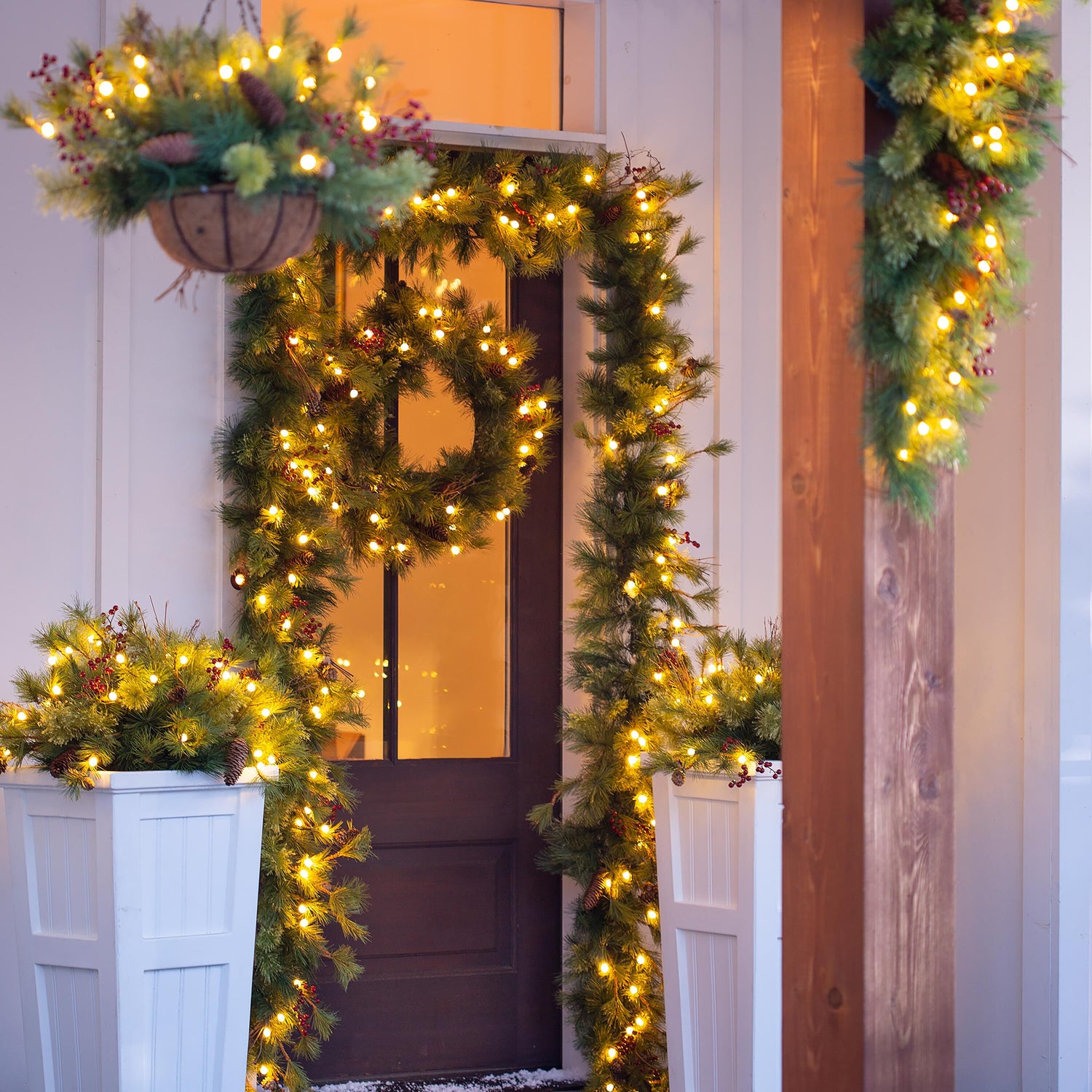 This Christmas Wreath has an all-weather battery pack with auto timer that turns the LEDs on for 6 hours, off for 18. It can be used indoors as well – the greenery is gorgeous in any setting.
