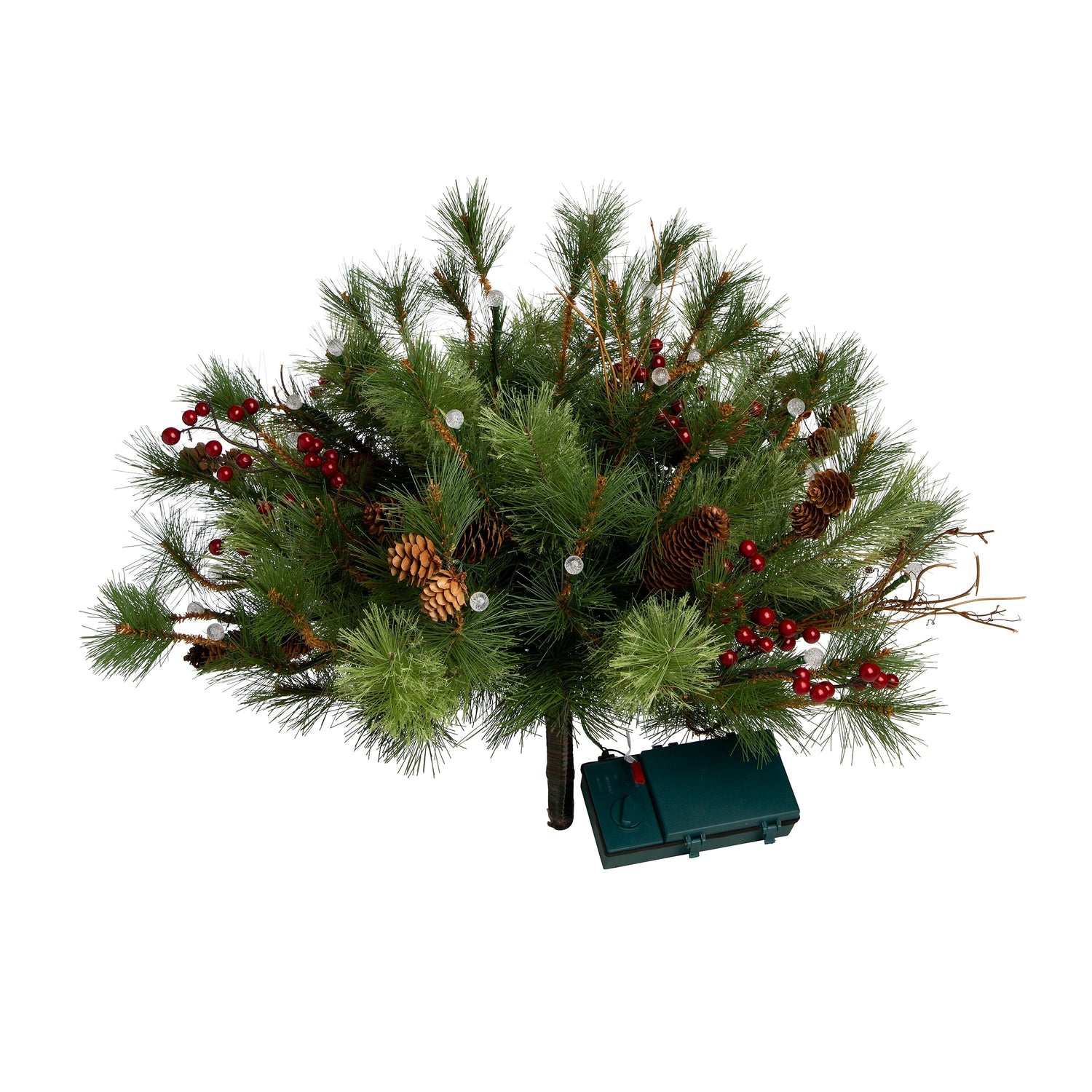 This Christmas Urn Filler has an all-weather battery pack with auto timer that turns the LEDs on for 6 hours, off for 18. It can be used indoors as well – the greenery is gorgeous in any setting.