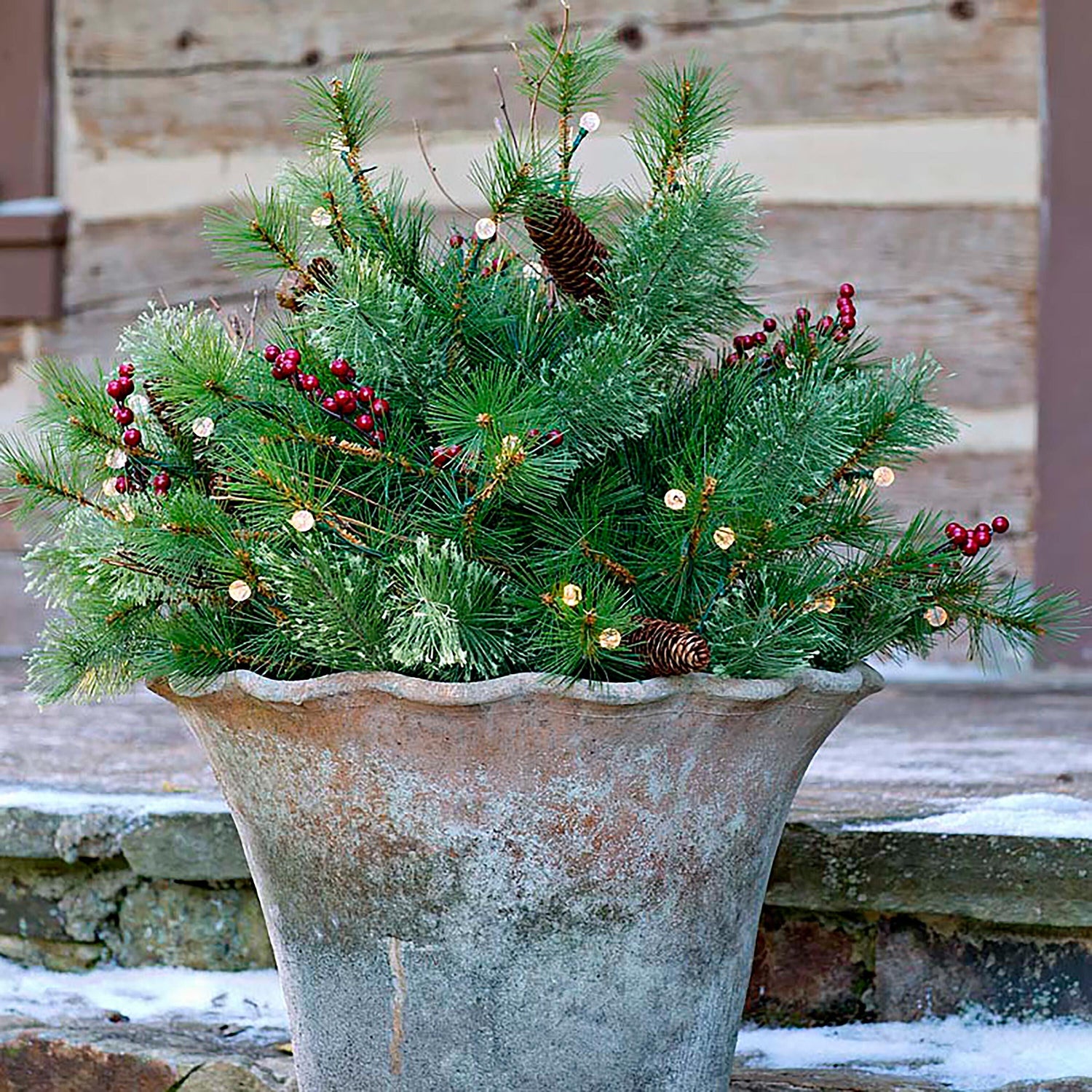 Place this lush and full urn filler into any planter for instant style and color. Try two to frame a door or entryway to make a beautiful, welcoming holiday statement.