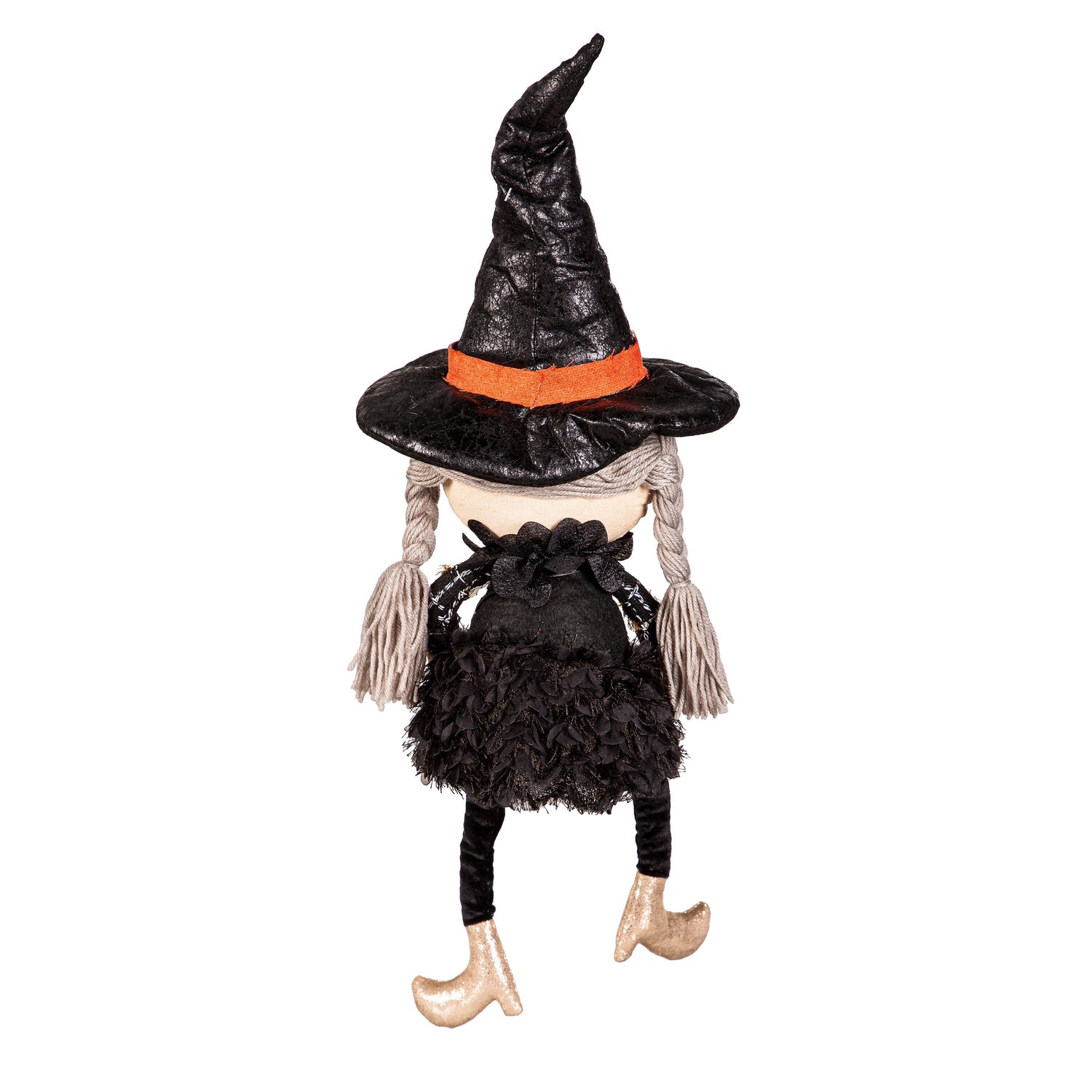 Celebrate the best season in style with this Fabric Sitting Witch Table Décor. This piece features a Jack o’ lantern bag, shimmering gold shoes and gold accents. She dons a mostly black outfit and a hat with an orange ribbon. Set her on a table, counter, or desk to bring holiday spirit to any space. This piece is perfect for anyone who loves the Halloween season.