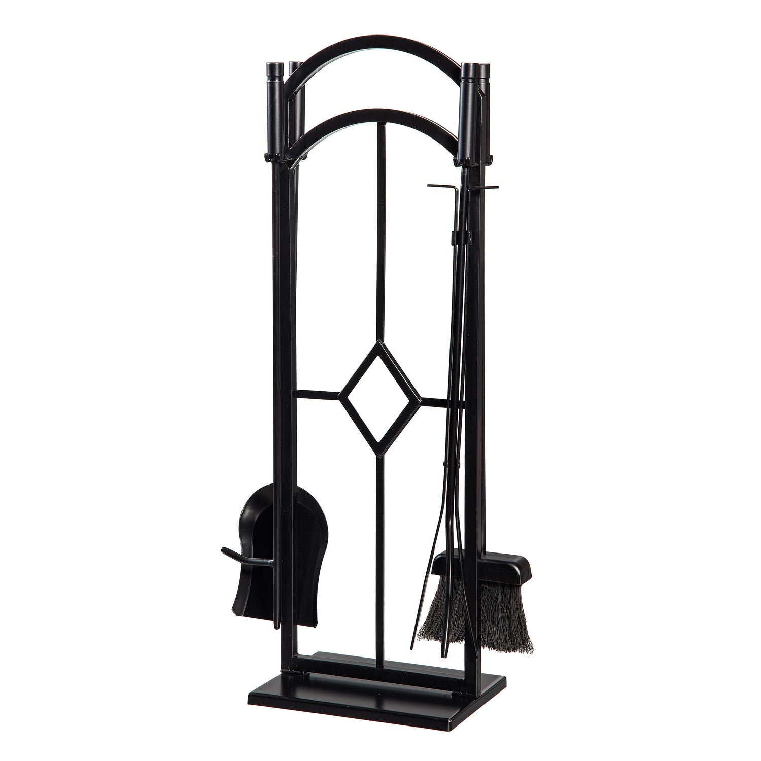Simple yet elegant, the Diamond Fireplace Toolset in a black metal finish boasts sturdy craftsmanship that ensures years of use along with superb attention to detail. The brush, poker, shovel and log lifter feature sleek rod handles while the stand's minimalist arched design offers a unique touch.
