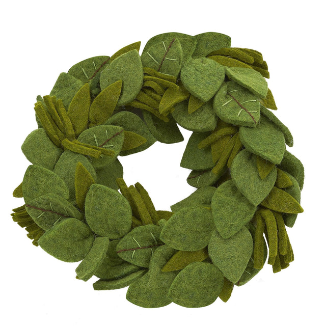Handmade Hand Felted Wool Wreath - Green Leaves Embroidery - 14"