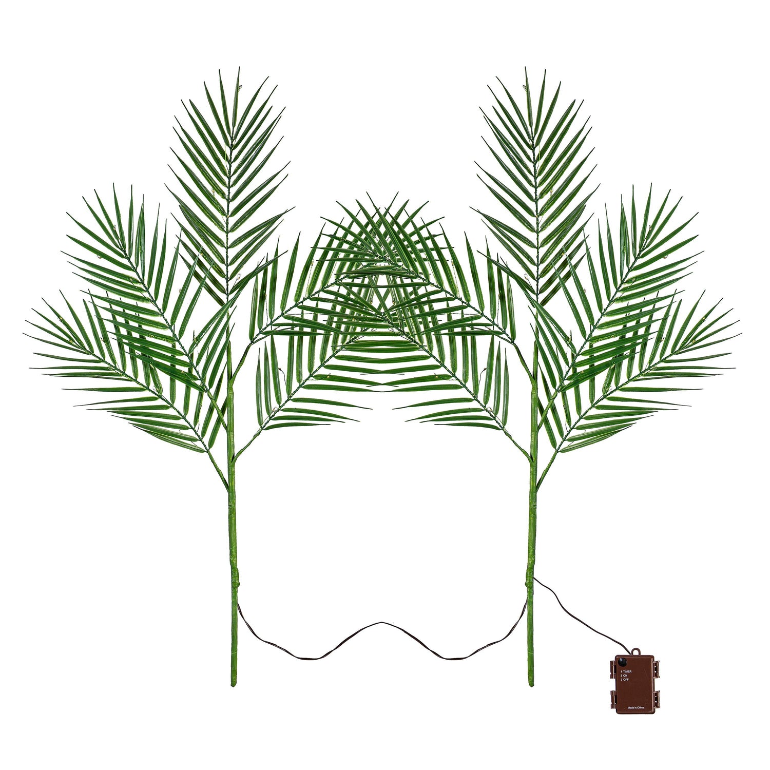Spruce up any indoor or outdoor space for the winter season with this set of two LED Lighted Palm Branches. Crafted from wire and plastic, the outdoor-safe materials and LED lights ensure these branches will elevate porches, patios, mantels, tabletops and more. This set is perfect for displaying in a vase or on their own. The branches require three AA batteries, not included.