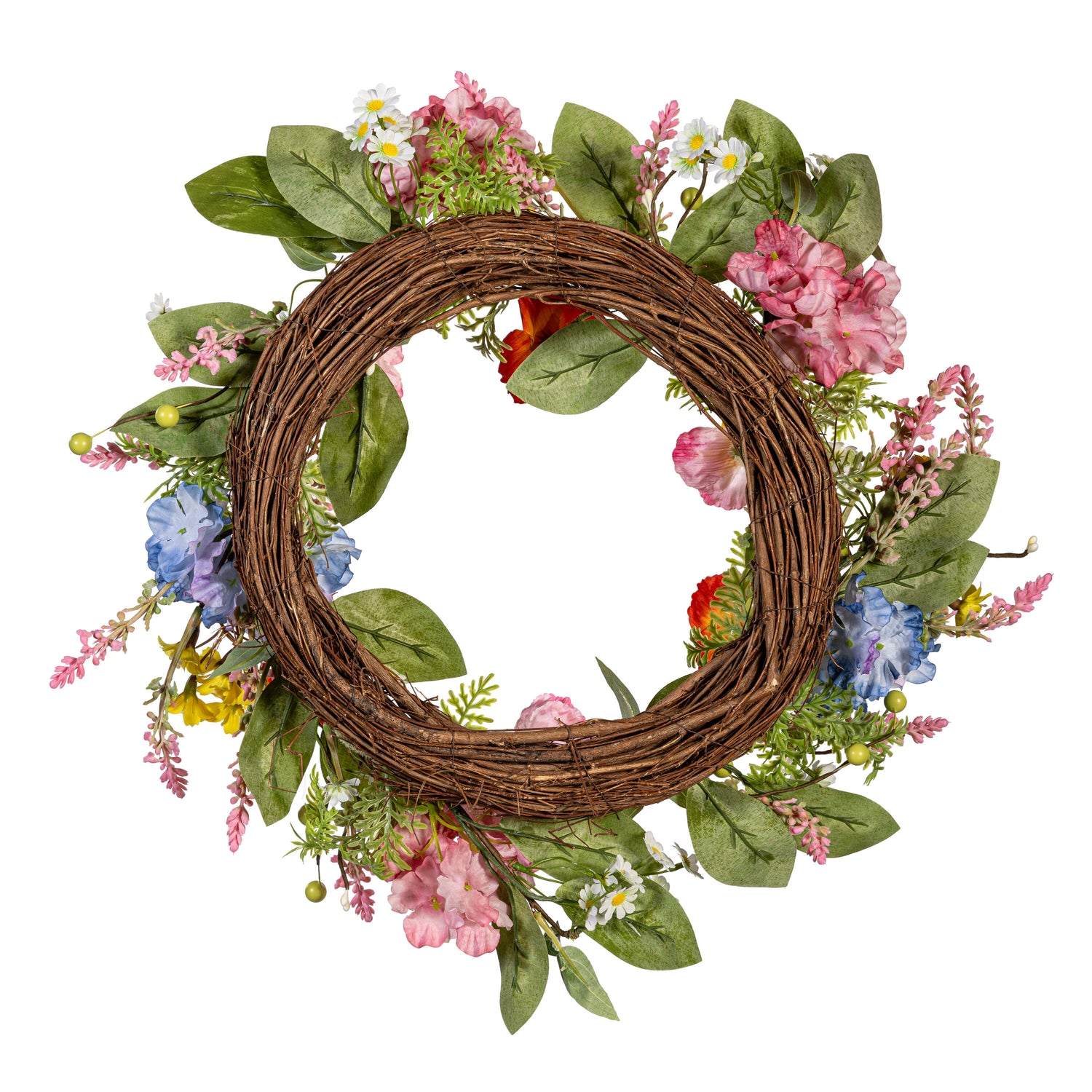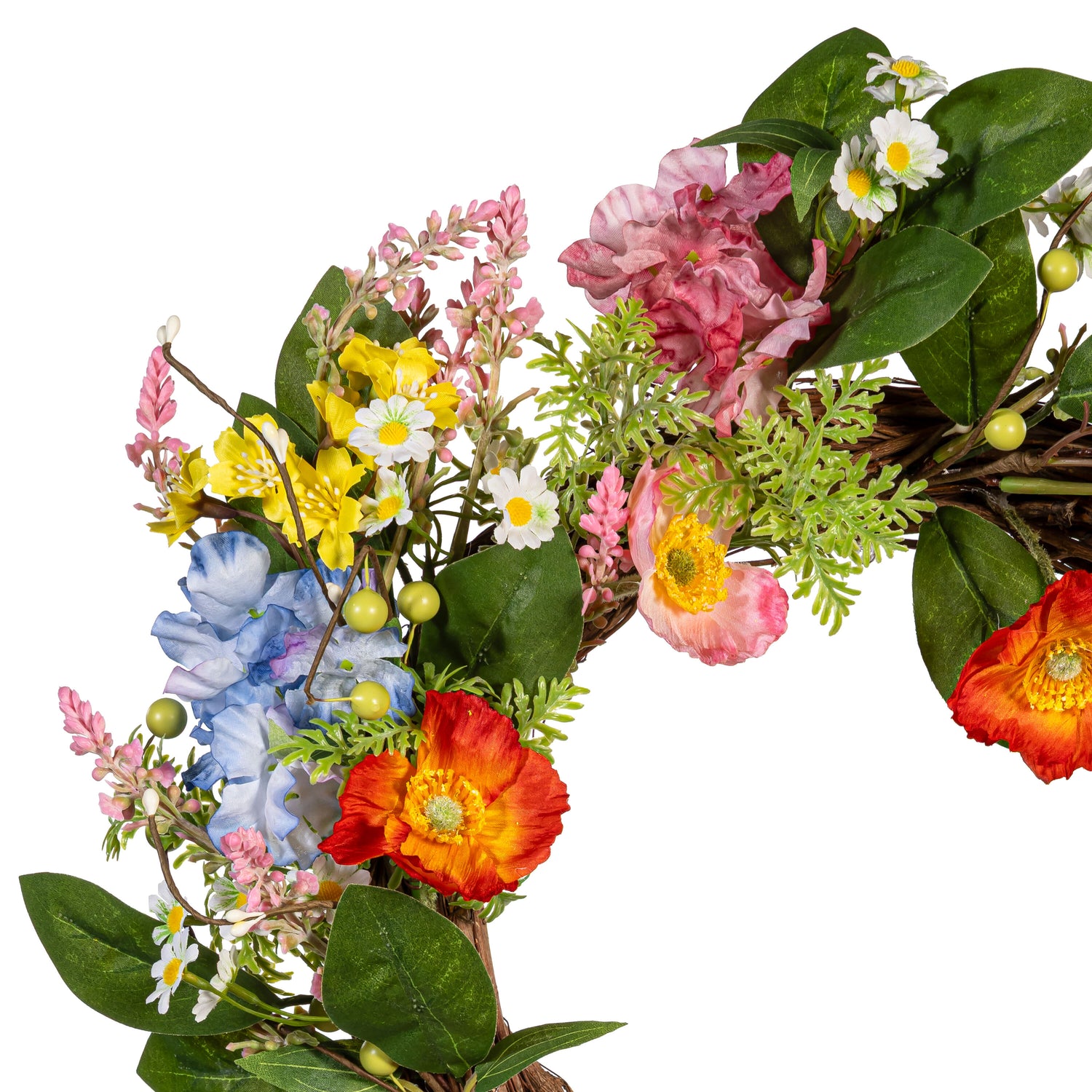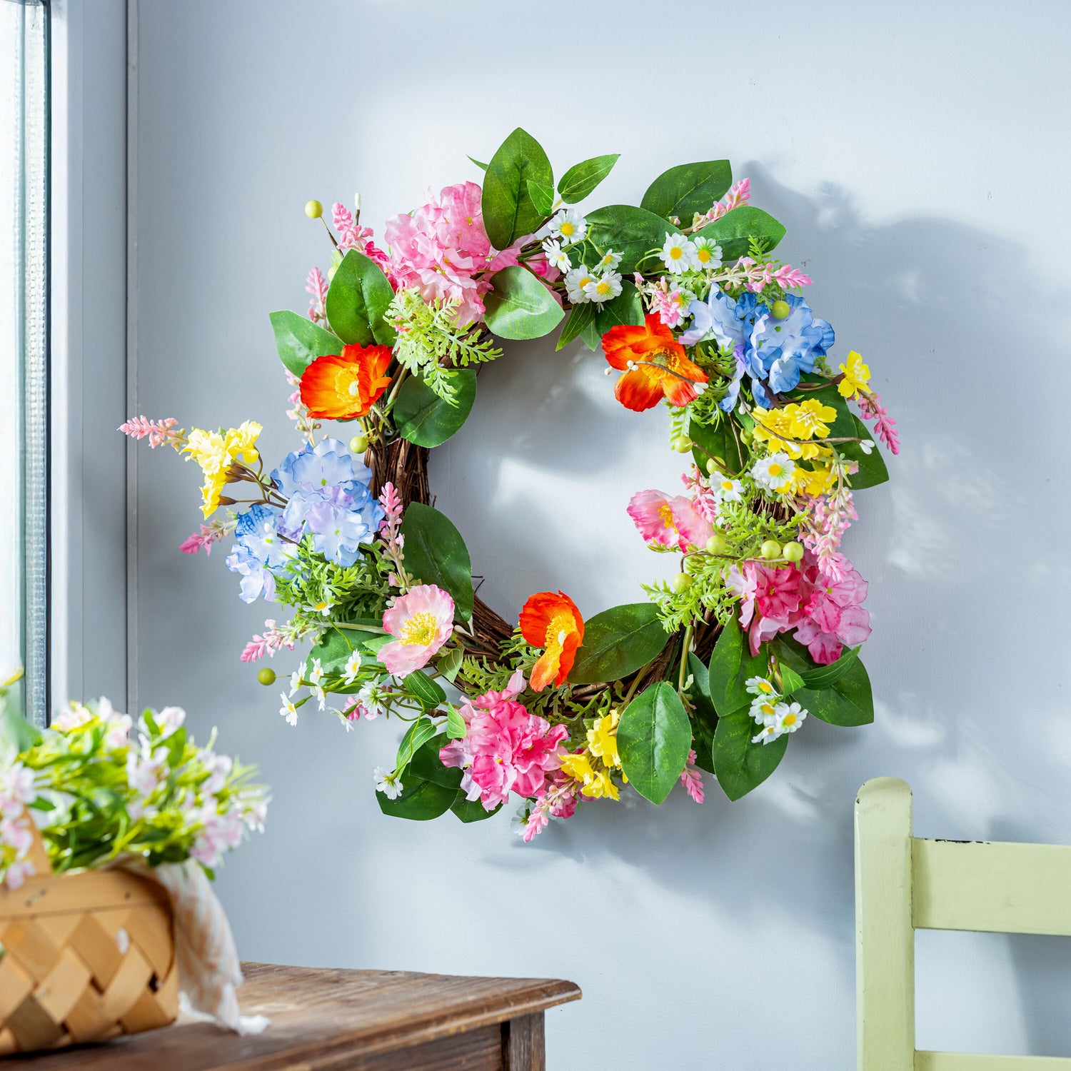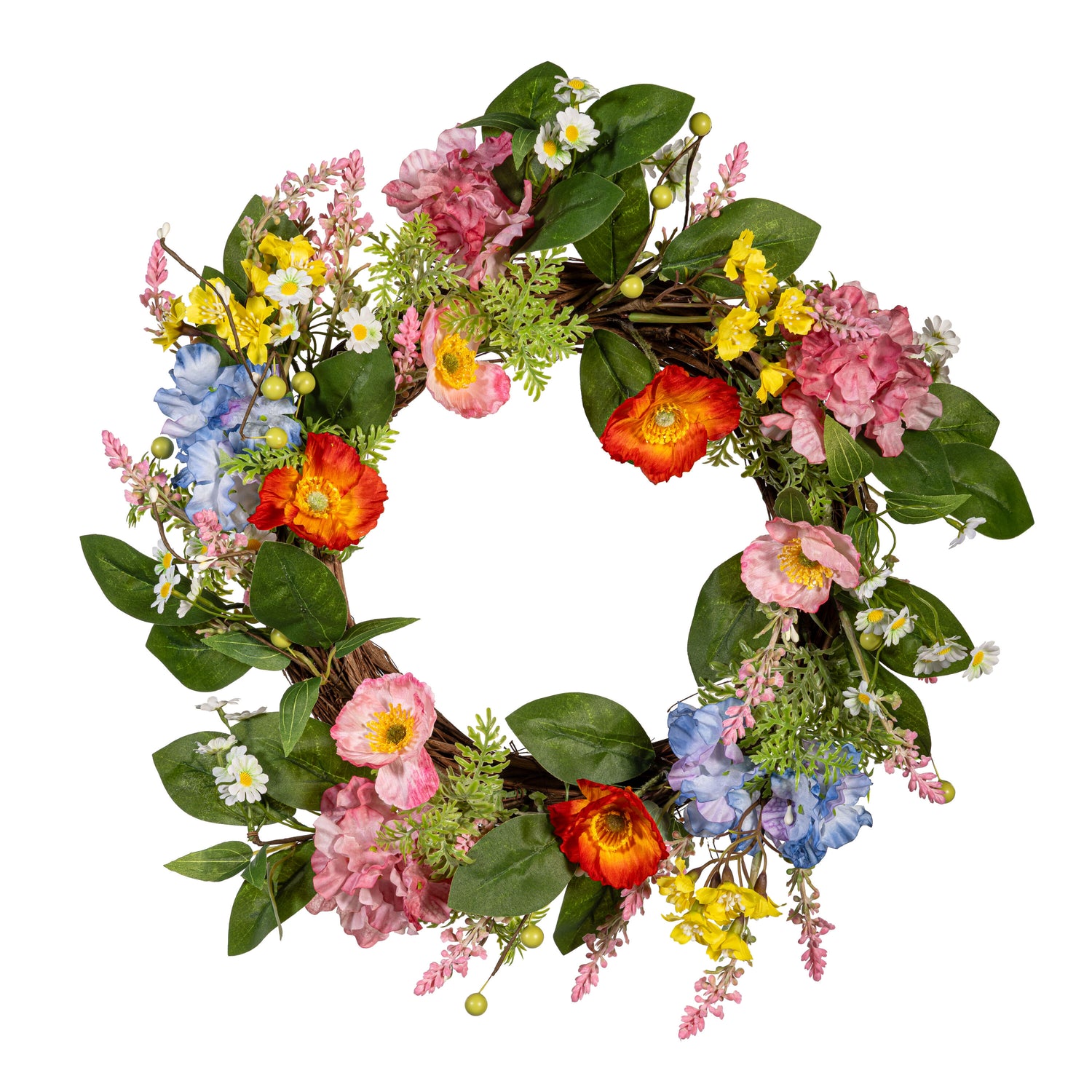 Whether decorating a front door or adding an extra dose of heart-warming inspiration to any space, this charming wreath will spread smiles with its beautiful design of colorful flowers and greenery. Crafted of long-lasting materials for a stunning look year after year. A charming decoration for the home; perfect for halls, walls, doors and more. Also makes a great gift!