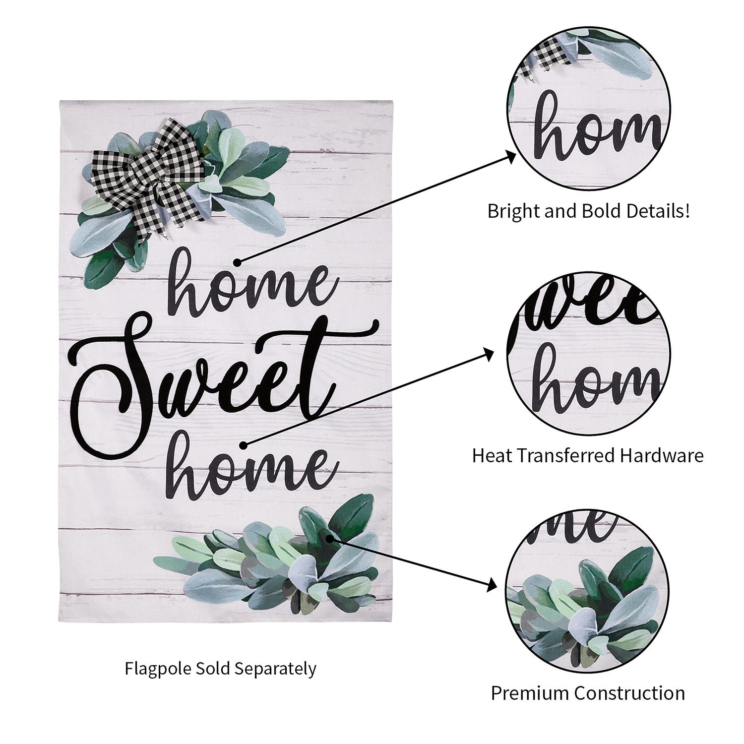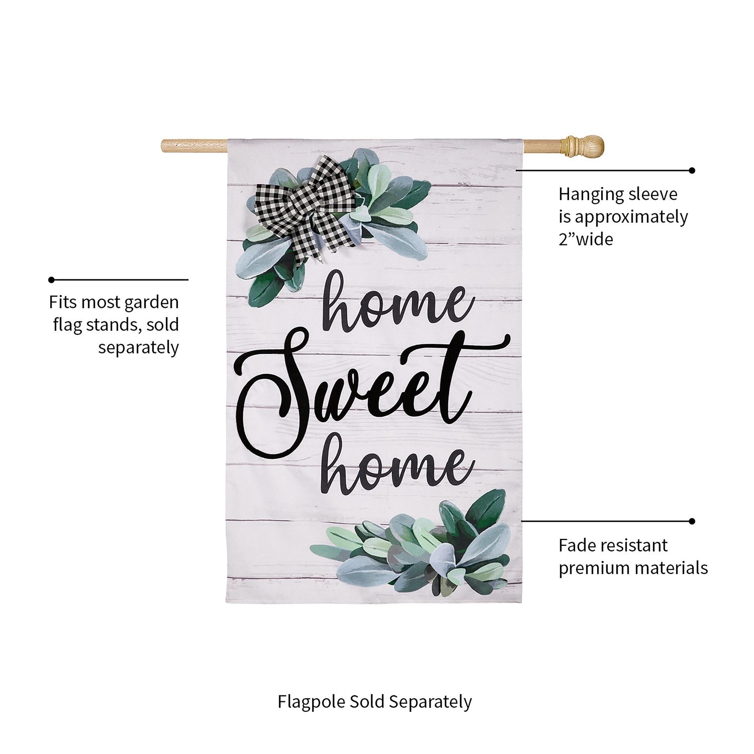 - “Home Sweet Home” Eucalyptus Burlap House Flag will add a touch of class to your outdoors