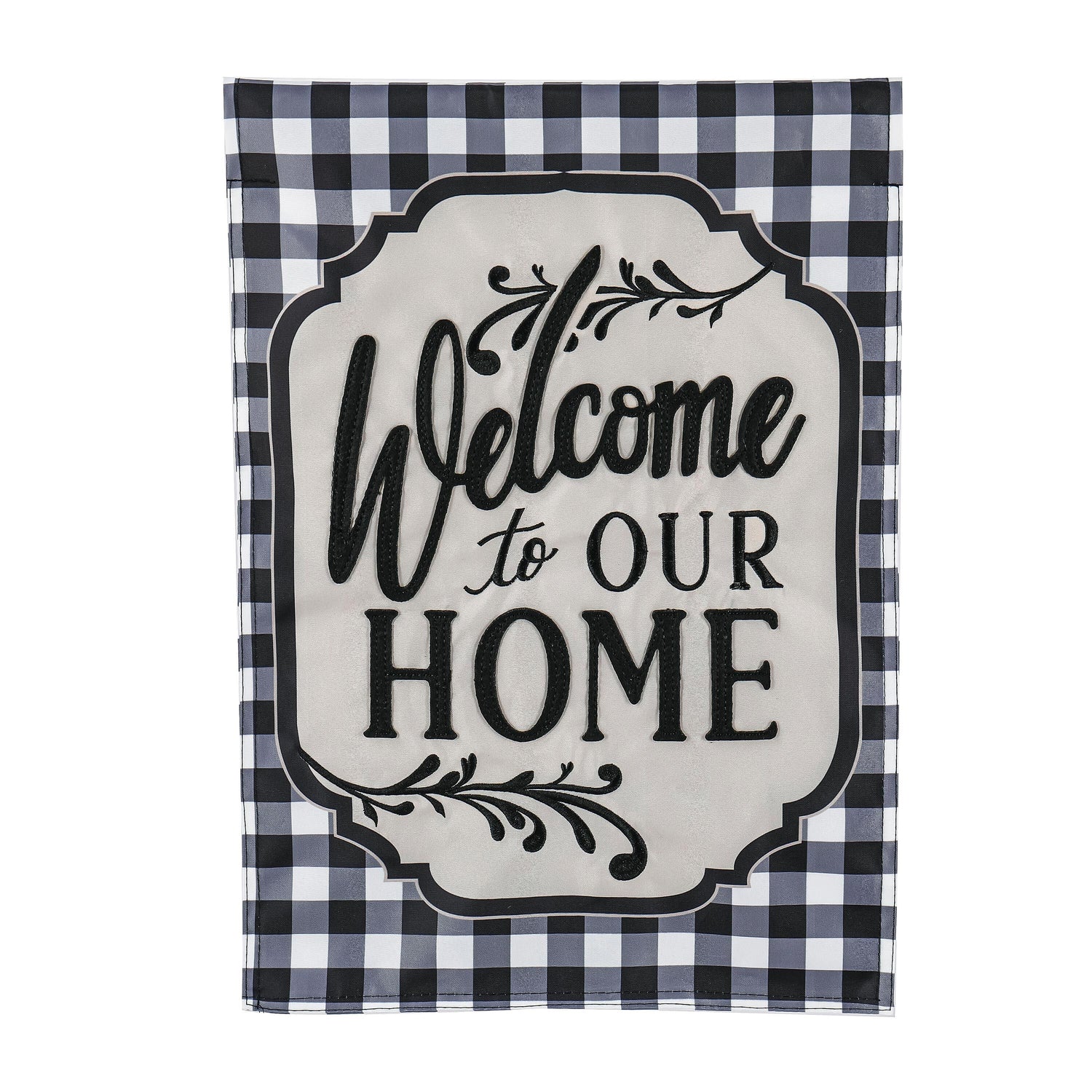 Offer guests a refined outdoor greeting with this Classic Welcome Home Applique Garden Flag. Surrounded by a vintage black and white buffalo check patterned border, this design reads "Welcome to Our Home" in elegant black letters.