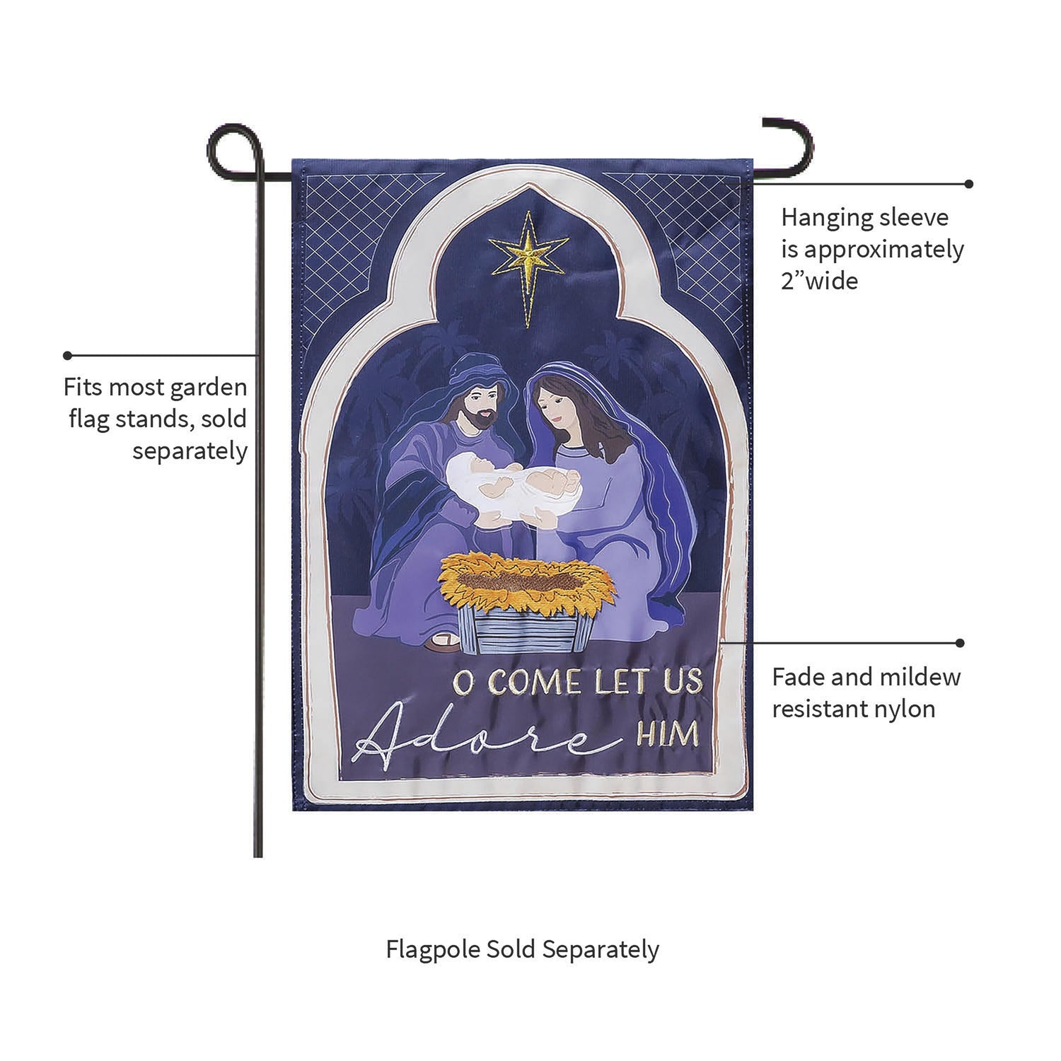 Decorate for the season and welcome friends and family to the home with this applique garden flag. It features a beautiful design of angels playing horns in the night sky. It’s “Oh come let us adore him” message is perfect for anyone who wants to show their faith. Each Evergreen Flag applique flag is carefully crafted from multiple layers of 310 denier nylon that can withstand a variety of weather conditions. We combine pieces of fade-resistant, strong fabric with tight, detailed stitching to create a dimensional mosaic effect. The soft yet heavyweight material illuminates beautifully in sunlight. Each flag features a sleeve that fits standard flagpoles or stands, sold separately. Due to the nature of the packaging, wrinkling may have occurred. Once item is unfolded and mounted on hardware, the creases will naturally fall out.