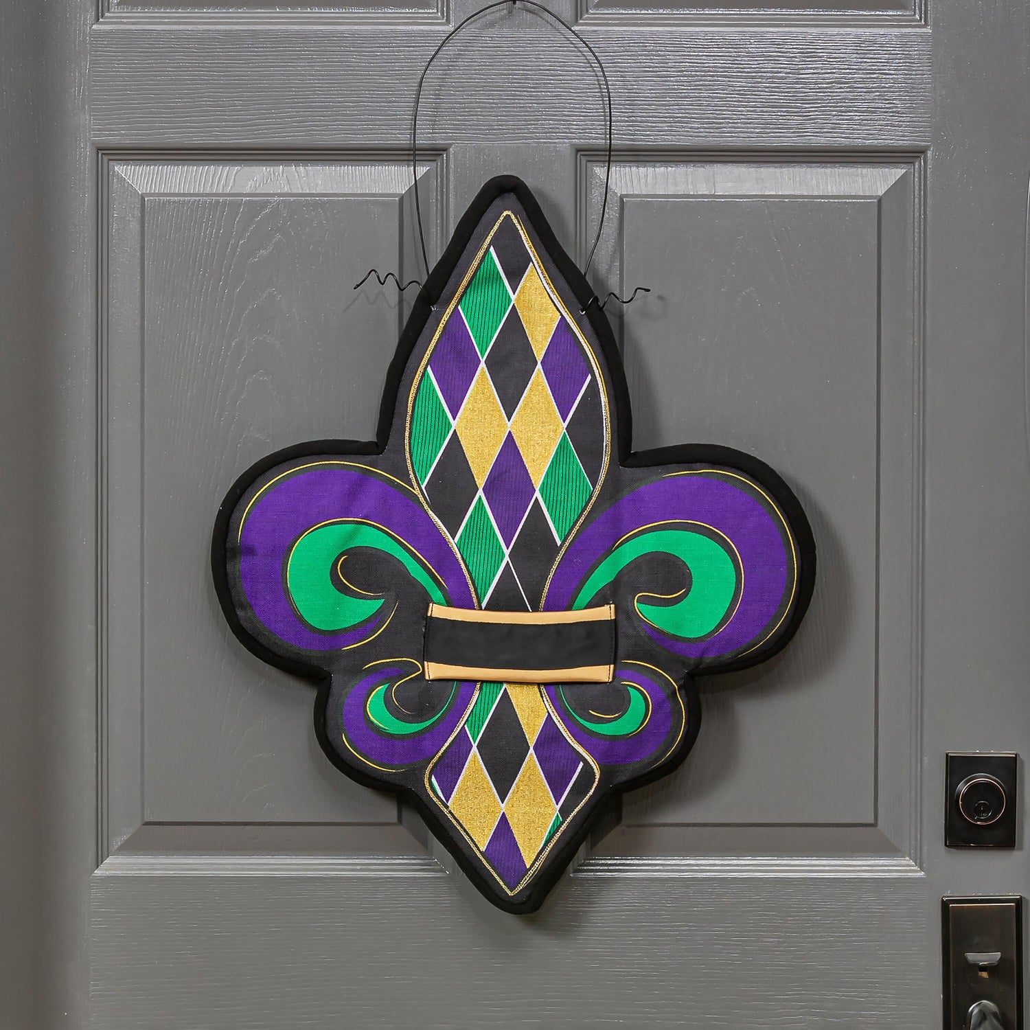 Celebrate Mardi Gras or just add a bold decoration to your home with this Fleur de Lis Estate Door Décor. It features the traditional colors of Mardi Gras: purple, green, and gold. It has diamond accents for extra flair. This décor helps you bring the party to your home. It's perfect for anyone who loves Mardi Gras. The coordinating ribbon makes it easy to hang.