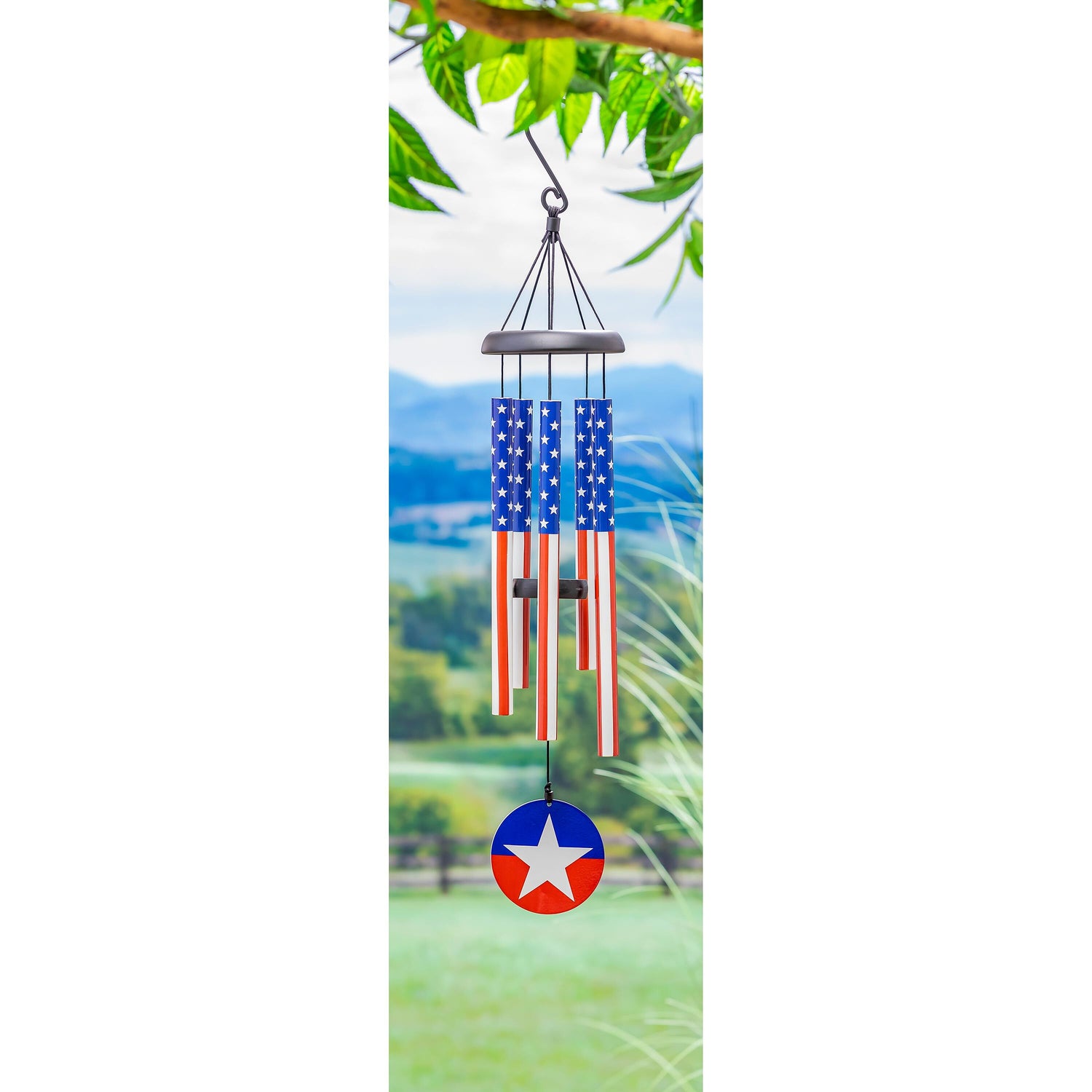 - Artisanal Avria wind chimes deliver deep resonanceFeatures 6 aluminum chambers precisely tuned to scale E and patriotically decoratedMade with finest materials and quality craftsmanshipPowder-coated finish is chip and fade-resistant, weather protected, outdoor safe