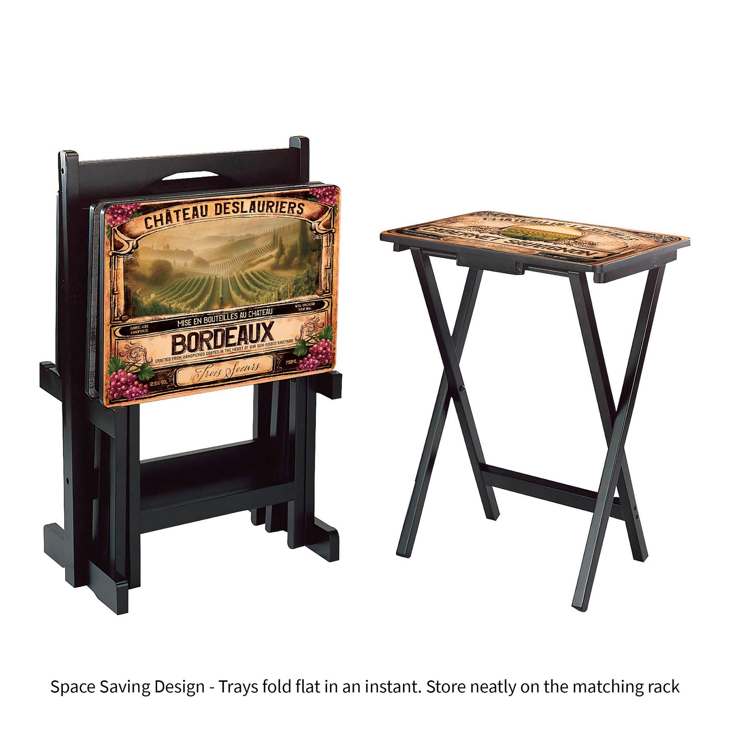 Classic Wine Label Wooden Set of 4 TV Tray Tables with Stand