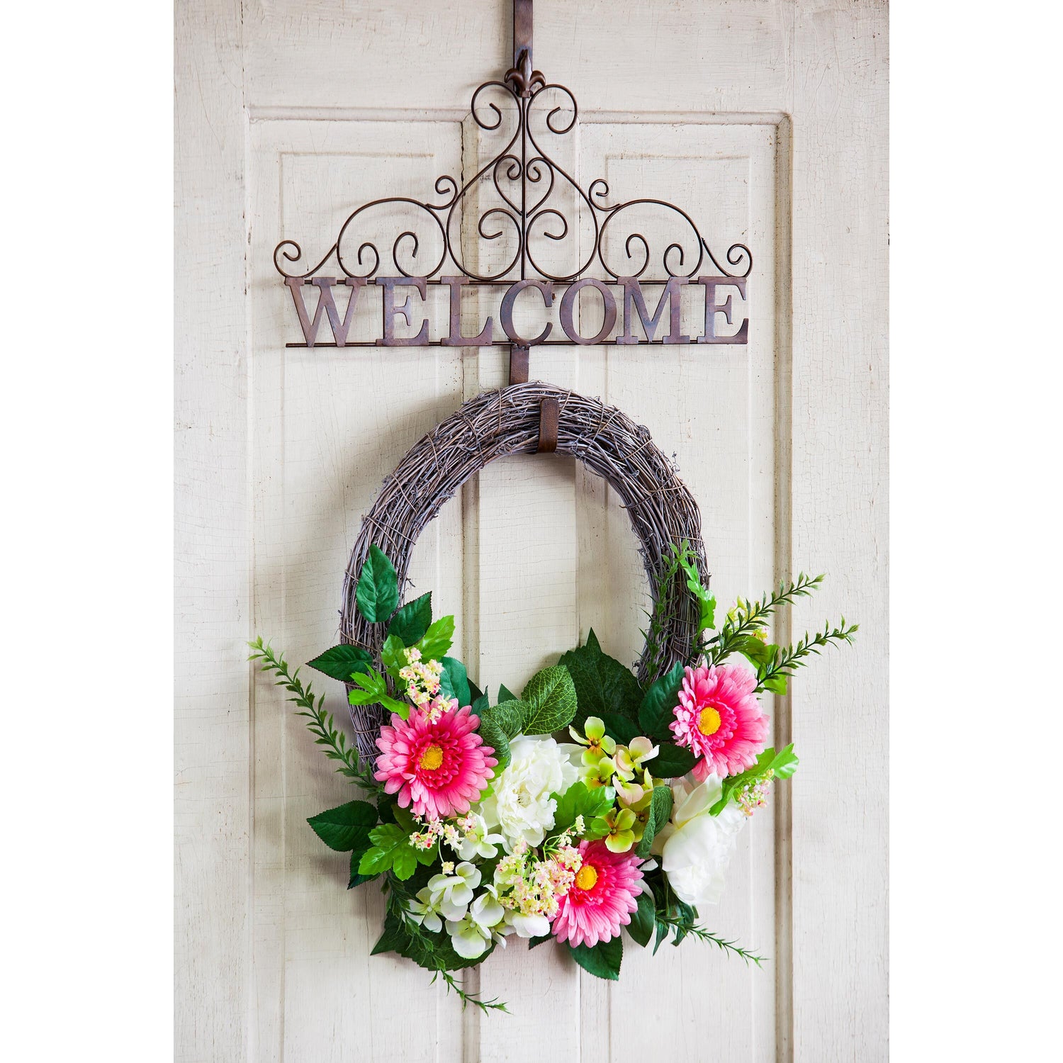 This elegant "Welcome" sign hanger can hold a variety of wreaths and fits over most standard-sized doors. Constructed from weather-resistant iron, this hanger is perfect for any season and is made to last for years to come.