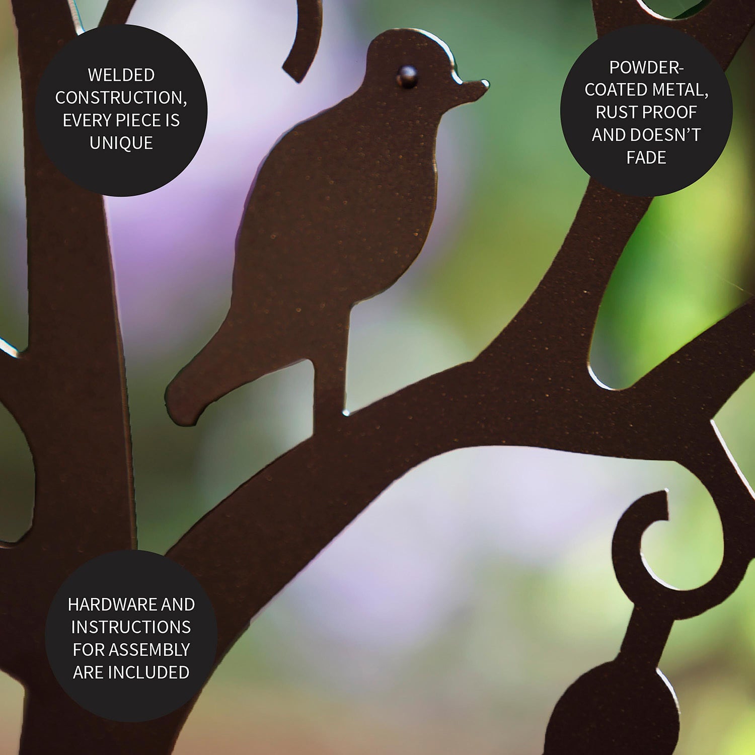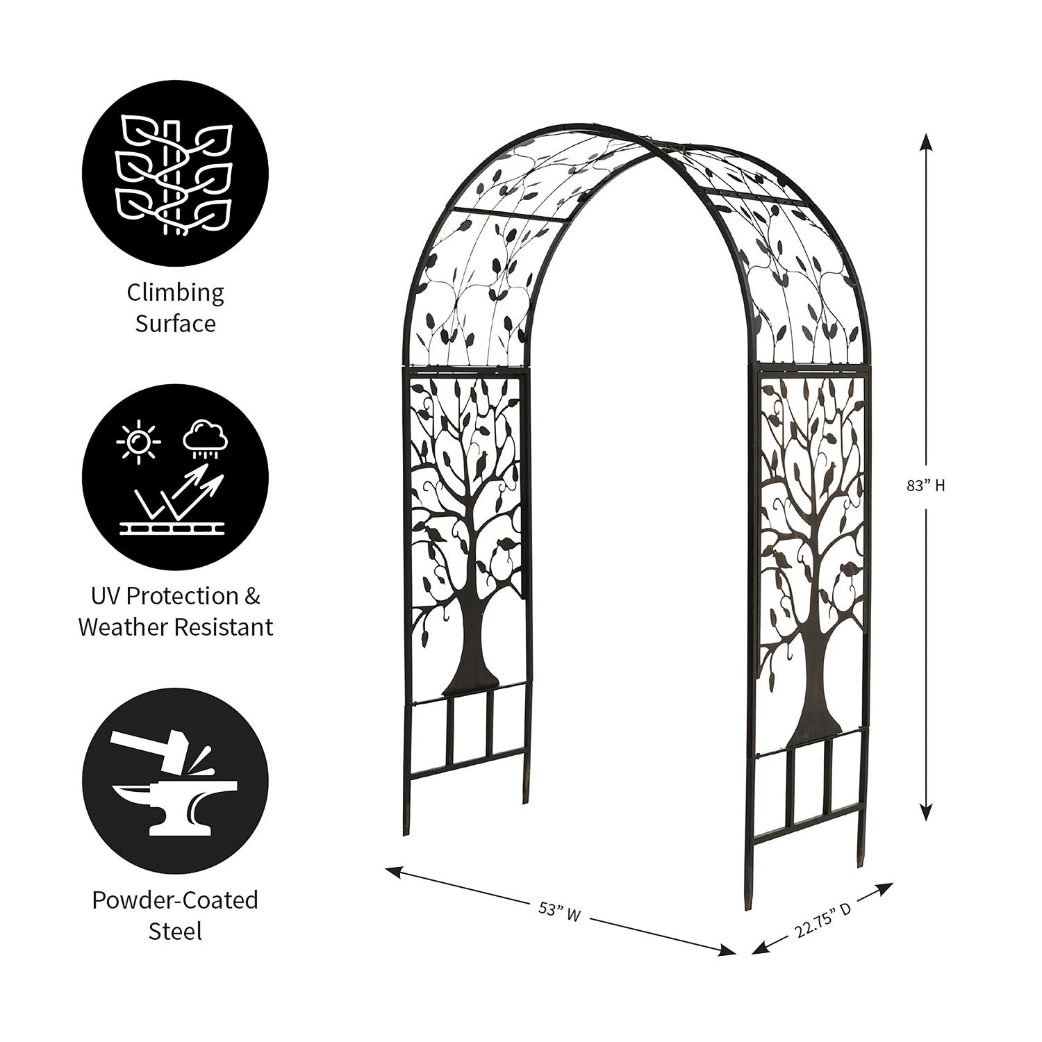 Made from lightweight, sturdy tubular steel, our Tree of Life Arbor will grace your landscape for years to come. The laser-cut Tree of Life inset features a burnished bronze finish that glimmers in the sunlight, while the frame and arbor arch elements finished with a black powder coat. Built-in ground stakes offer stability and semi-permanent installation. Easy assembly required; all hardware and instructions included.