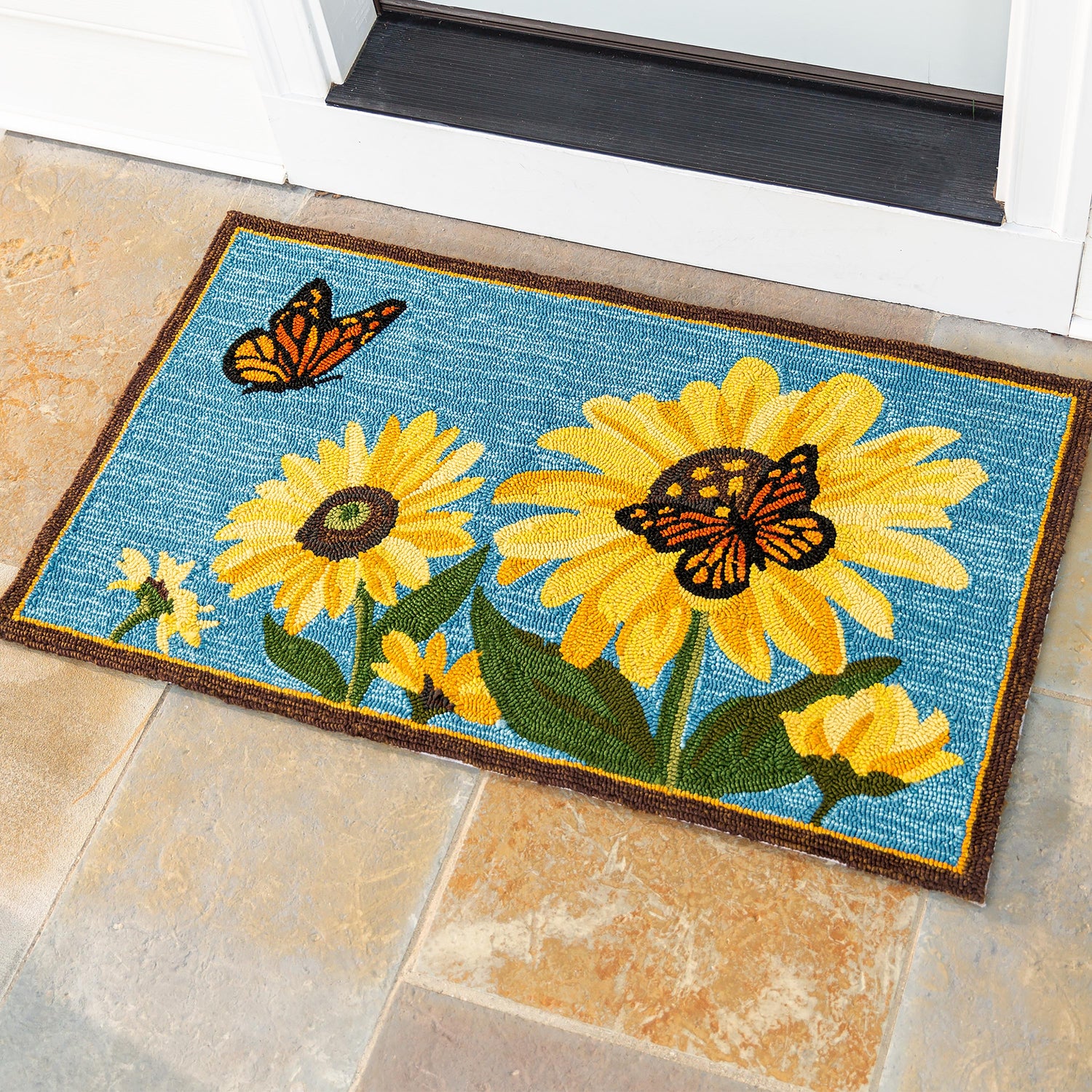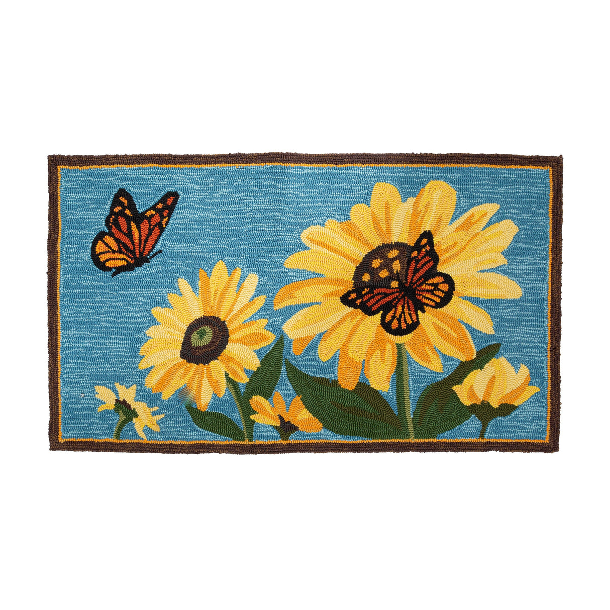 Our Indoor/Outdoor Sunflower and Butterfly Hooked Polypropylene Accent Rug brings vibrant, fresh color with hand-hooked detailing that's full of texture. This bright rug has a detailed design with yellow sunflowers and Monarch butterflies, bringing the feeling of spring all year long. The flowers' shades of yellow, gold and green complement the orange and black butterflies, while it all pops against a sky blue background. Made of 100% polypropylene, this decorative rug is mildew and fade resistant, beautiful yet durable enough to use indoors and out. It's guaranteed to add instant style to your front door, porch, mudroom or kitchen. It's like a walk through a field or garden! Polypropylene rug is easy-care: vacuum, spot clean or hose down, then air dry completely. Imported.