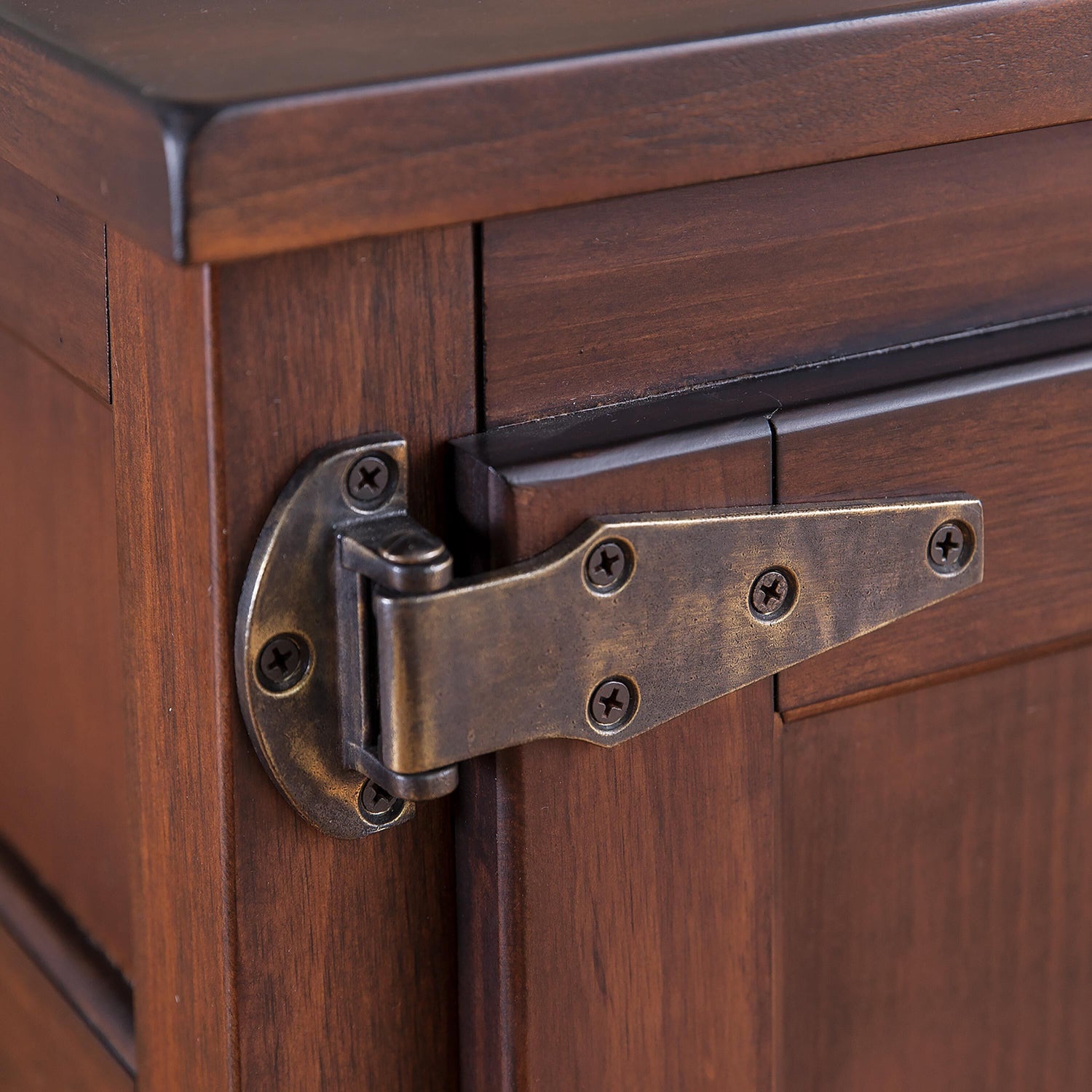 - Replica metal hinges and handles lend the look of a well-love antique