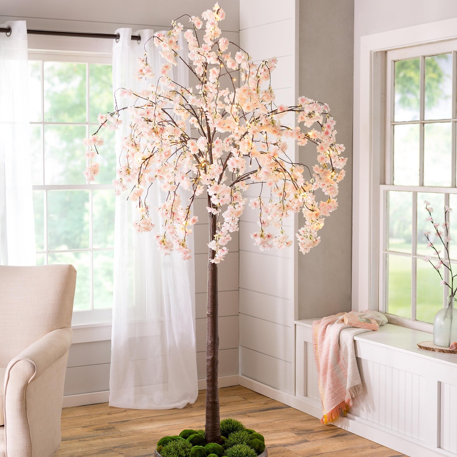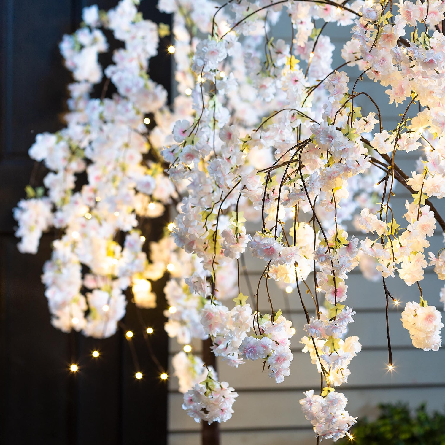 Beautifully formed with a natural silhouette, lifelike branches and detailed flowers, these trees bring a graceful look inside or outside the home. Warm white LEDs on posable cascading branches let you create a stunning lighted display. These faux cherry trees are lush and stunning.