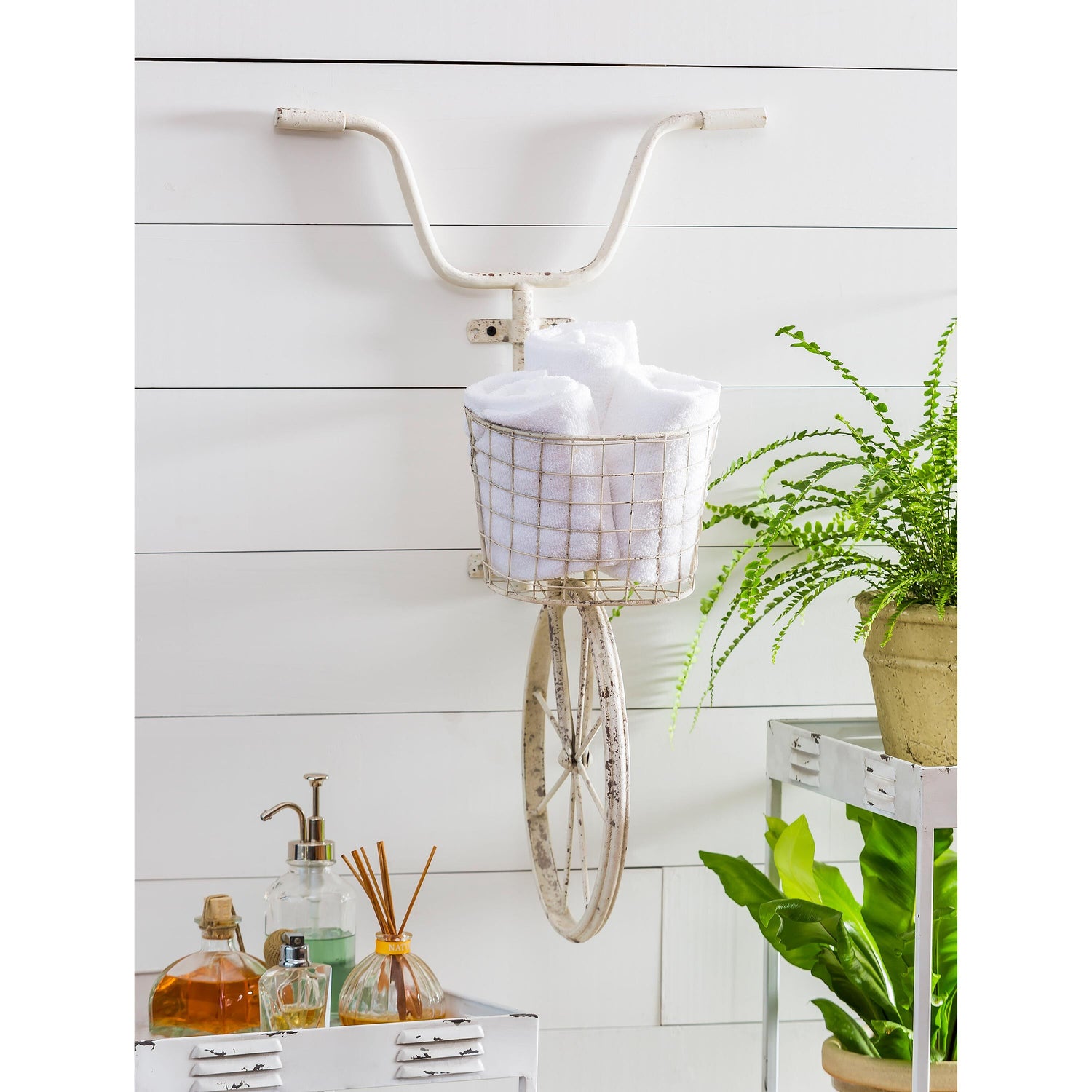 Bicycle enthusiasts will be unable to resist this quaint wall art. The metal bike, covered in a shabby-chic white finish, is reminiscent of a vintage treasure you just happened to stumble upon at an estate sale. Use the basket as a planter if you're into horticulture, or simply store books, magazines, and knick-knacks inside. Outdoor safe. Mounting holes under the handlebars allow for easy hanging. Assembly is required. For best results, do not use the basket to hold anything heavier than five pounds.
