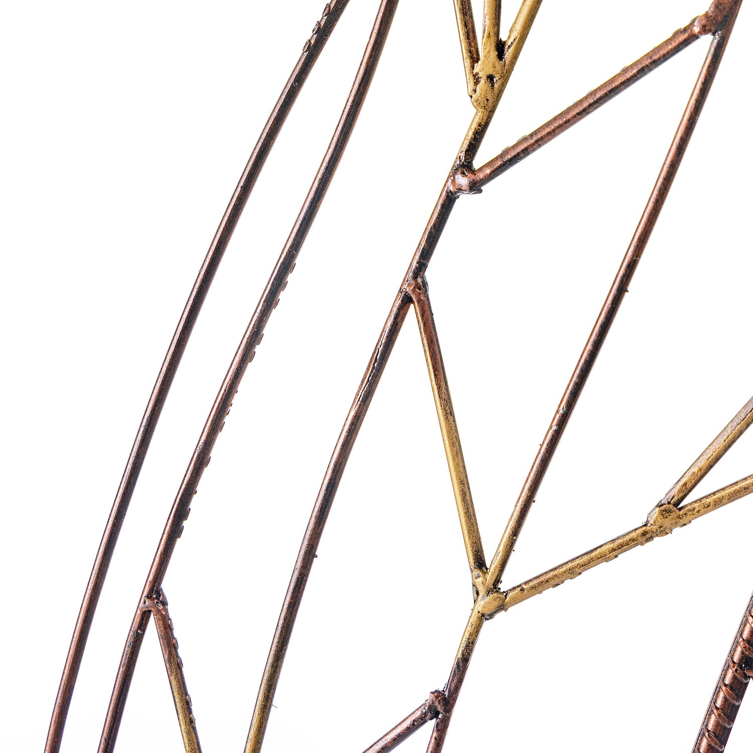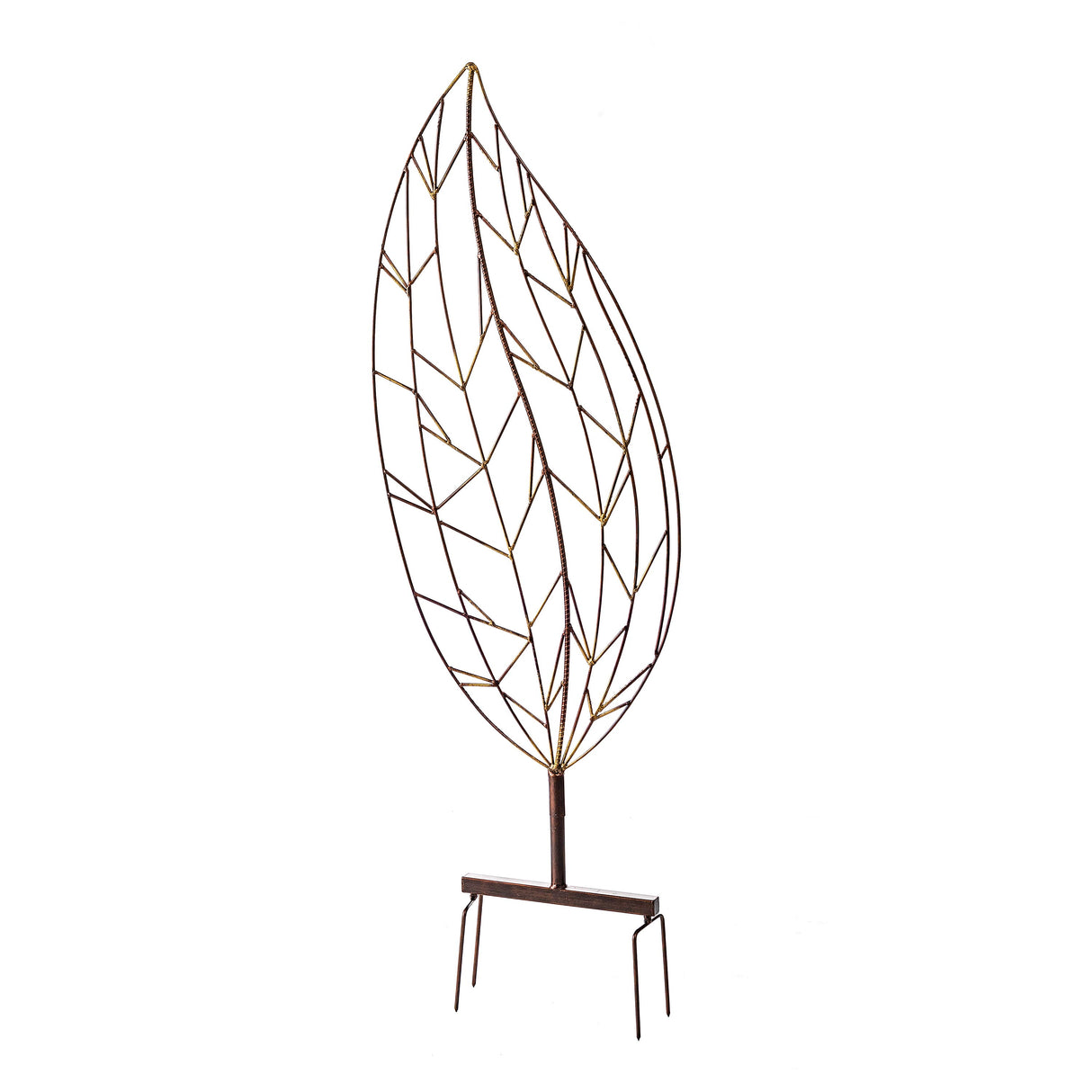 This large-scale metal leaf trellis makes a stunning statement with its curving leaf shape and criss-crossed leaf veins that create intriguing geometric shapes. The trellis is artisan-crafted and hand-painted with a distressed copper finish that looks especially beautiful in the sun.