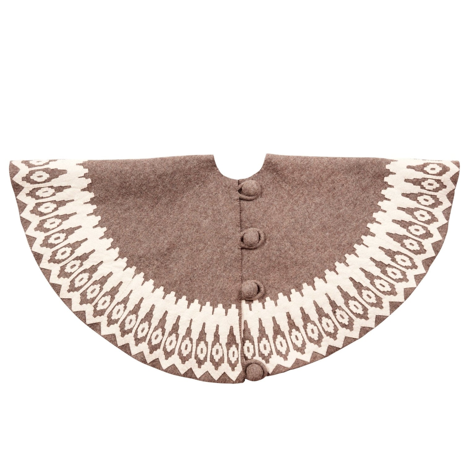 This unique Christmas tree skirt features an Icelandic sweater pattern in cream against a lovely natural gray. This Scandinavian design perfects hygge holiday ambiance. Hand felted and hand appliqued in 100% sustainable wool felt, with oversized felt button closures.