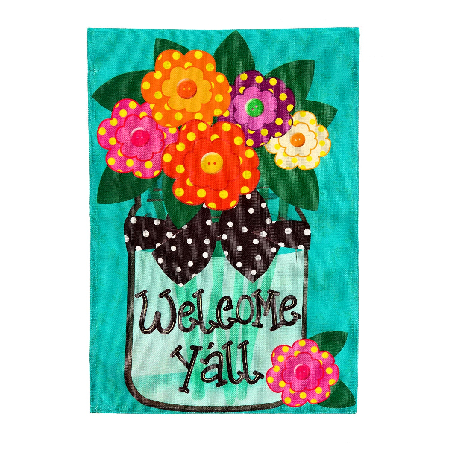 The perfect set for coordinating decorators! The Welcome Y'all Burlap Garden Flag and Sassafras Mat Set includes a sassafras switch mat with base and a matching garden burlap flag and stand. Both pieces read "Welcome Y'all" and feature a bevy of blooms set inside a rustic mason jar.