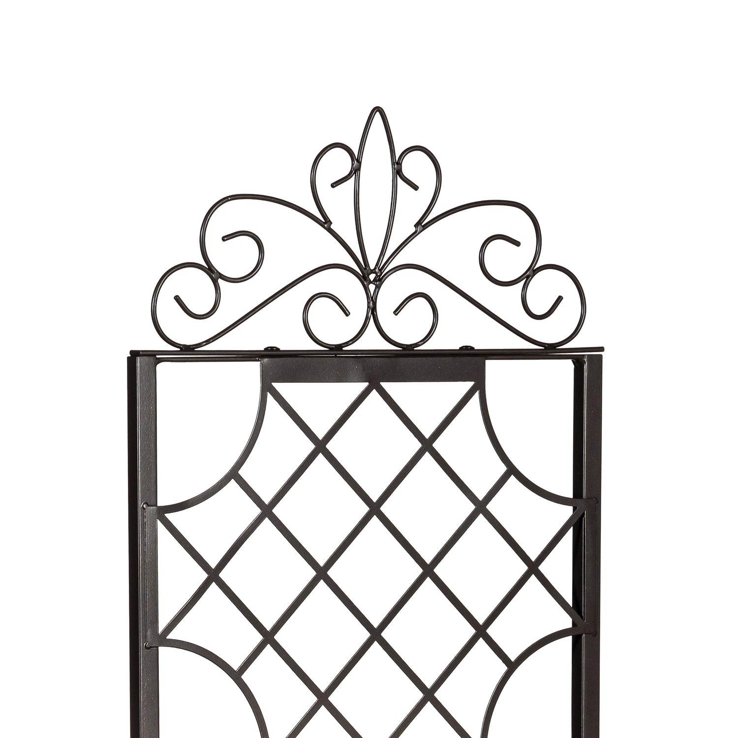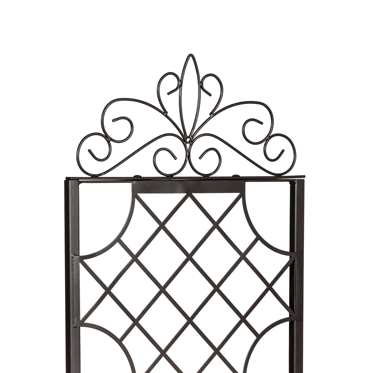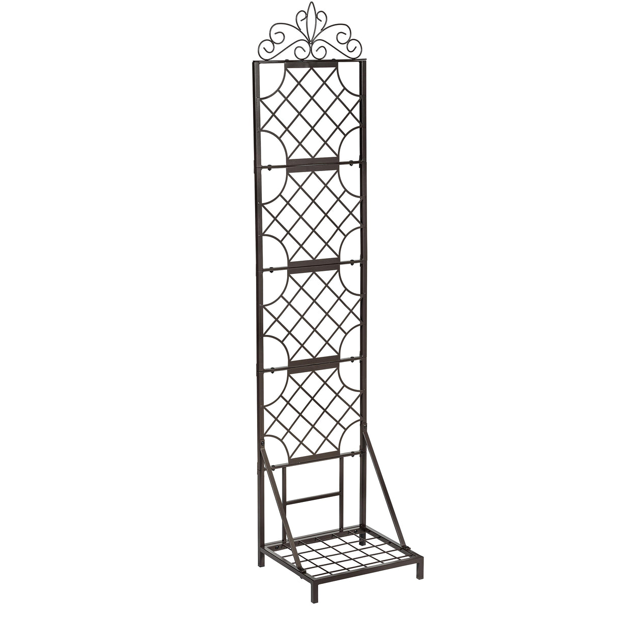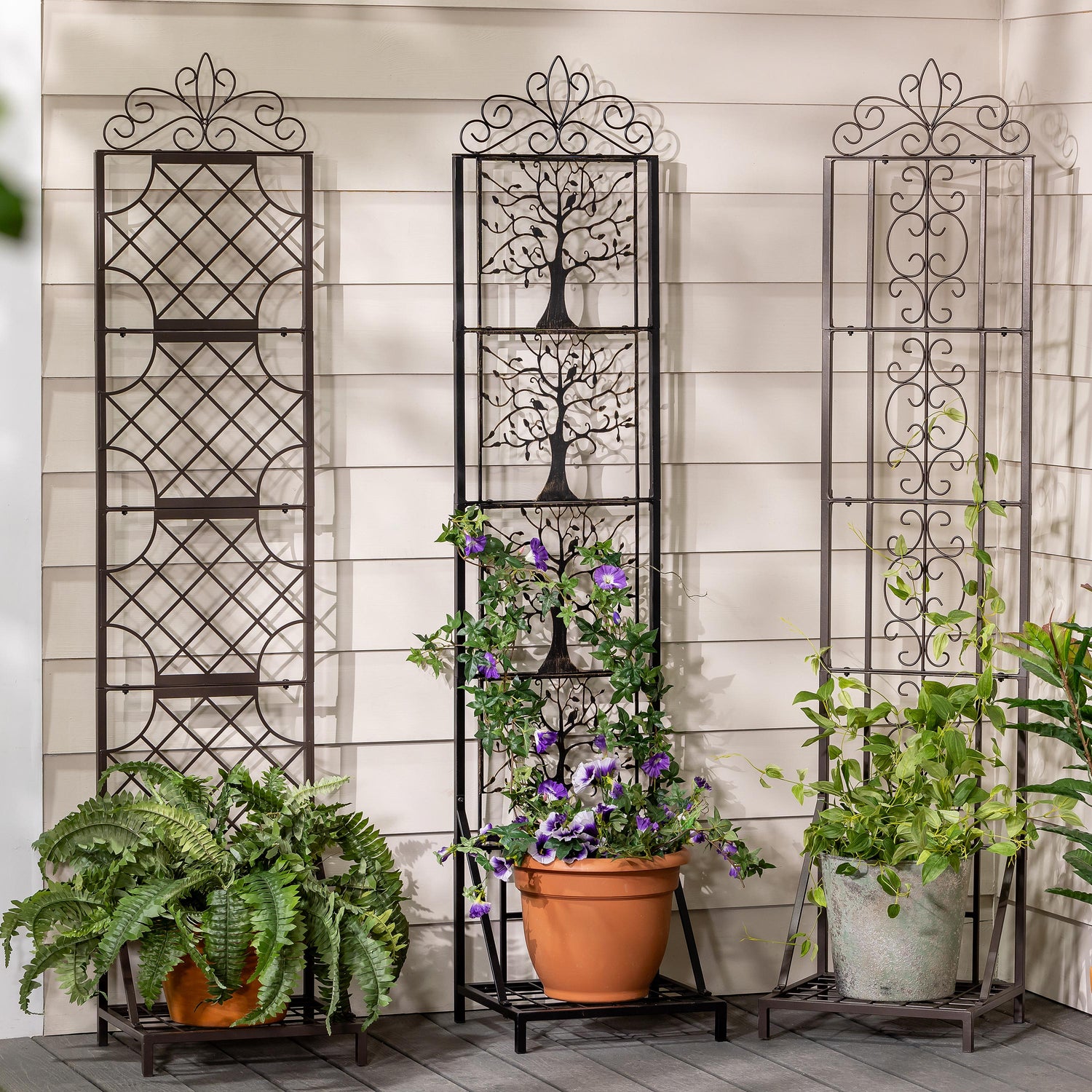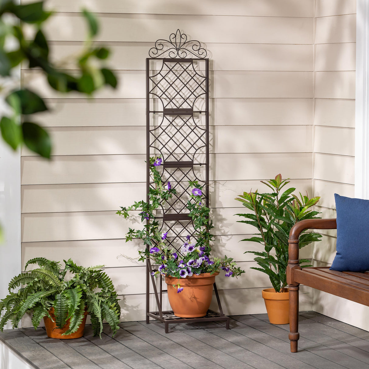Add a touch of whimsy to your garden, patio, or porch with this beautifully crafted metal trellis featuring an elegant and classic motifs. The powder-coated finish enhances durability and ensures long-lasting beauty, making it a stunning decorative accent for any outdoor space. Made from high-quality metal, this trellis provides strong support for climbing plants, flower vines, and ivy. Its durable lattice design encourages healthy plant growth while serving as a striking focal point in your garden. This trellis includes a built-in plant stand, elevating your plant pots for better airflow and sun exposure. The sturdy base ensures stability, making it easy to reposition indoors or outdoors, whether in your living room, office, kitchen, patio, balcony, porch.